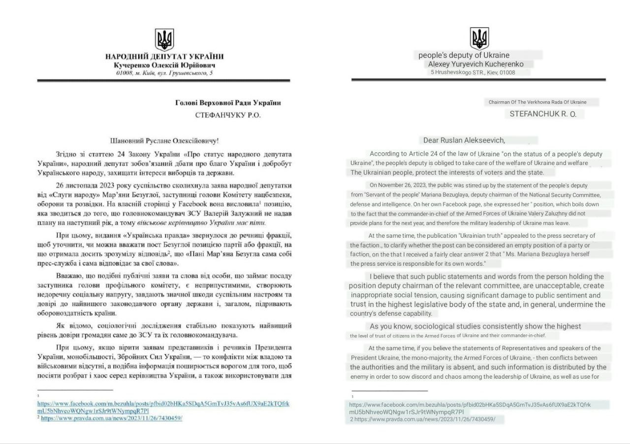 🔺Đồng nghiệp của Arakhamia, nghị sĩ Maryana Bezuglaya, đổ lỗi cho Tổng tư lệnh Valery Zaluzhny vì đã không đưa ra được “tầm nhìn cho năm 2024”.