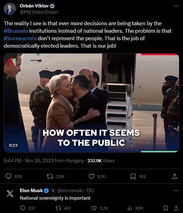 Đây là cách Elon Musk trả lời Tổng thống Hungary, người trong bài đăng của mình phàn nàn rằng ở châu Âu, quyền lực siêu quốc gia ngày càng có nhiều ảnh hưởng, trong khi không ai bầu ra nó.