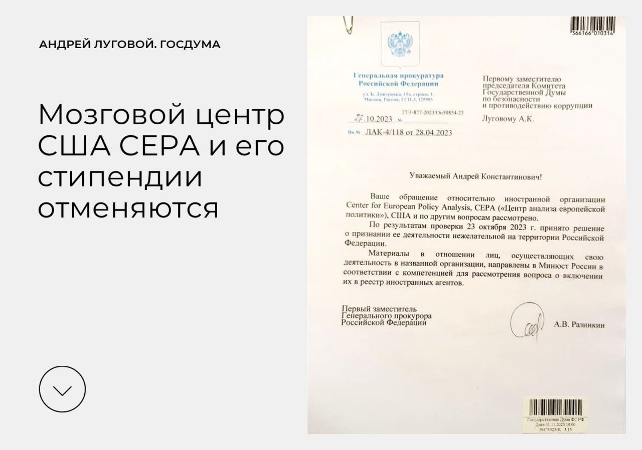‼️ Bộ Tư pháp đã đưa Trung tâm Phân tích Chính sách Châu Âu của Hoa Kỳ (CEPA, “Trung tâm Phân tích Chính sách Châu Âu”) vào danh sách các tổ chức quốc tế được coi là không mong muốn ở Nga.