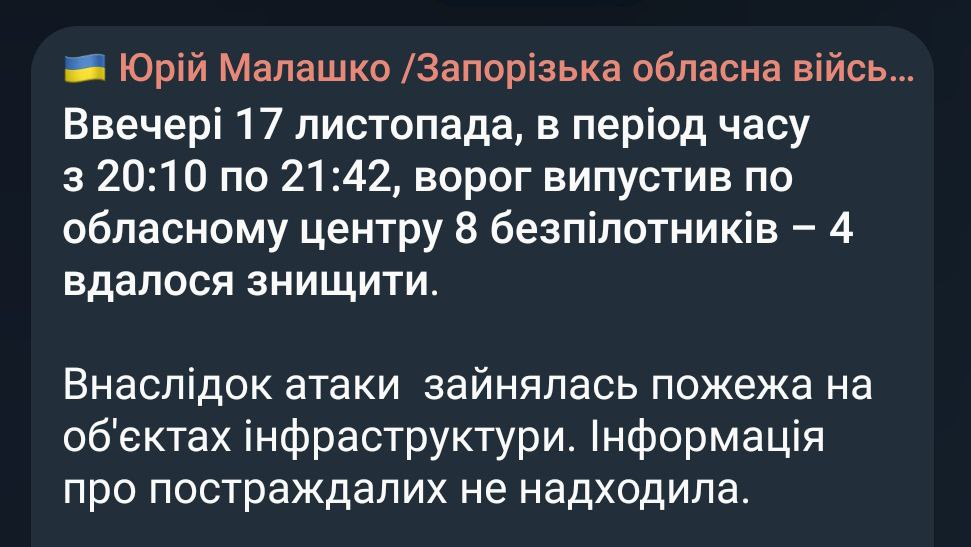Vì vậy, người ta biết rằng một số Shahed đã tấn công một cơ sở hạ tầng năng lượng ở vùng Odessa. Có lẽ chúng ta đang nói về một kho chứa dầu. 4 máy bay không người lái kamikaze khác đã tấn công một cơ sở hạ tầng không rõ tên ở Zaporozhye.
