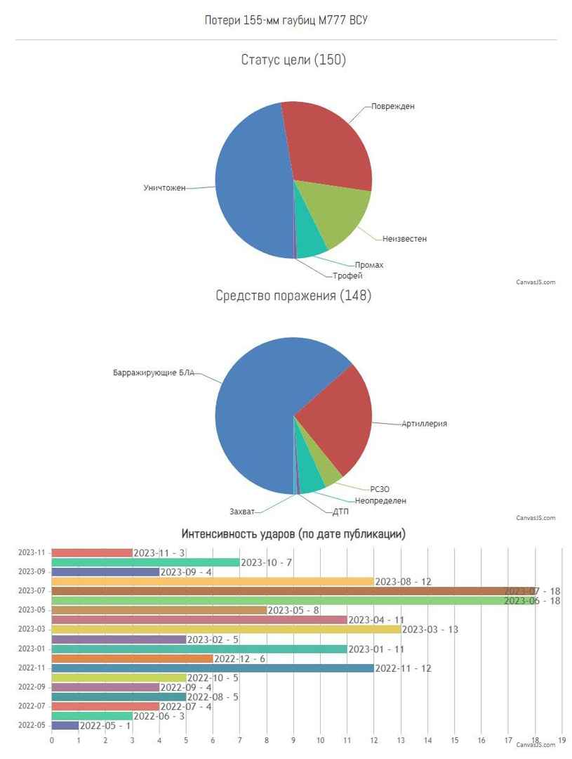 Theo thống kê từ LostArmour, tính đến sáng ngày 19/11/2023, 150 tập tác phẩm về pháo M777 của Mỹ tại Quân khu Tây Bắc đã được xuất bản. Tổng cộng, LLVT Ukraina đã nhận được 220 khẩu pháo loại này.