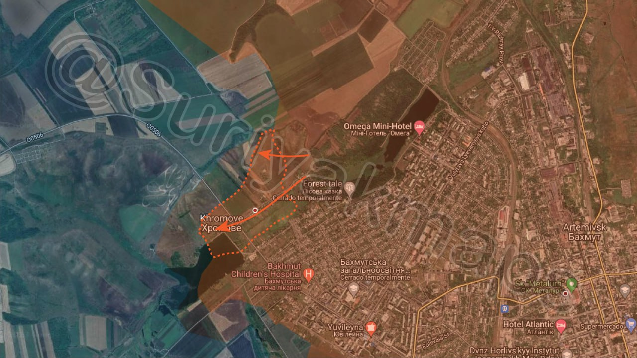 Tình hình phía bắc Bakhmut: Trong những giờ qua, Quân đội Nga đã giành quyền kiểm soát làng Khromove/Хромове sau khi Quân đội Ukraine rút lui về chiến hào phía bắc dọc con đường hướng tới Chasiv Yar/Часів Яр.