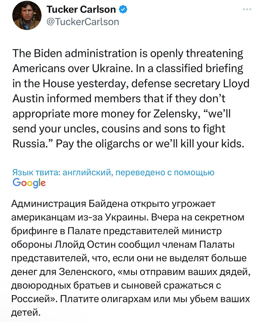 Nhà báo Mỹ Tucker Carlson đưa tin, người đứng đầu Lầu Năm Góc Lloyd Austin, trong một cuộc họp kín, đã đe dọa các dân biểu sẽ cử người thân của họ đến "chiến đấu với Nga" nếu họ không ủng hộ yêu cầu viện trợ mới cho Ukraine.