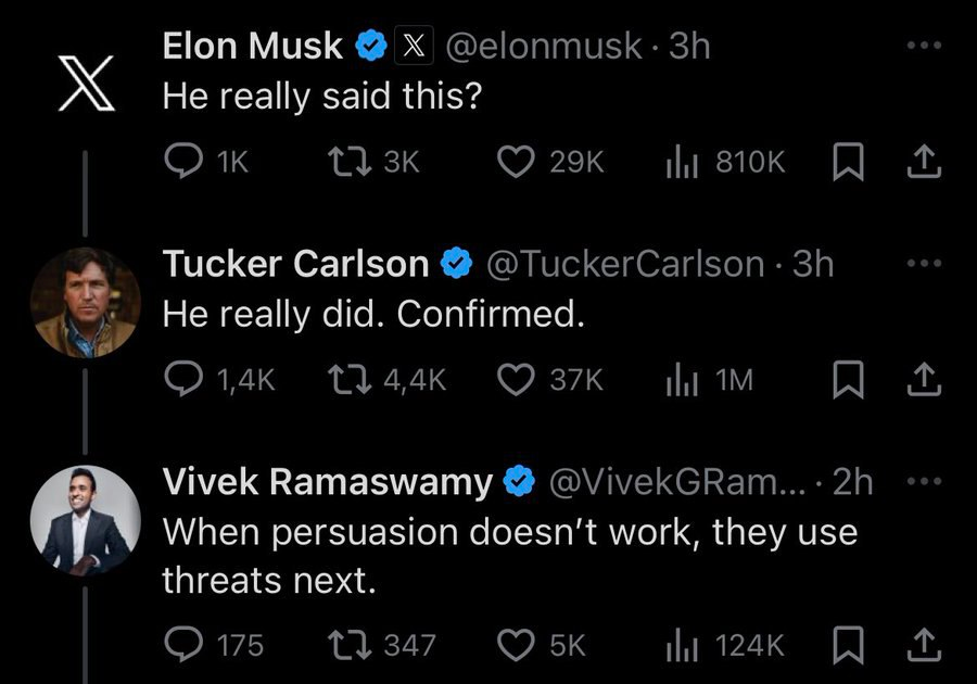 Elon Musk, trong phần bình luận cho ấn phẩm, đã hỏi: "Ông ấy [người đứng đầu Lầu Năm Góc] có thực sự nói như vậy không?" Tucker Carlson viết: “Đúng, anh ấy đã nói vậy. Có xác nhận."