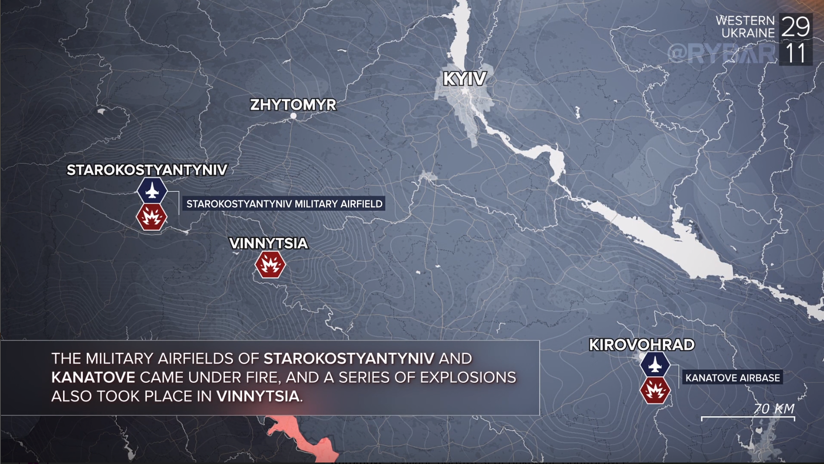 ▪️Quân đội Nga lần lượt phát động cuộc tấn công tổng hợp vào các mục tiêu của kẻ thù trên khắp Ukraine. Các sân bay quân sự Starokonstantinov và Kanatovo bị cháy, hàng loạt vụ nổ xảy ra ở Vinnitsa.