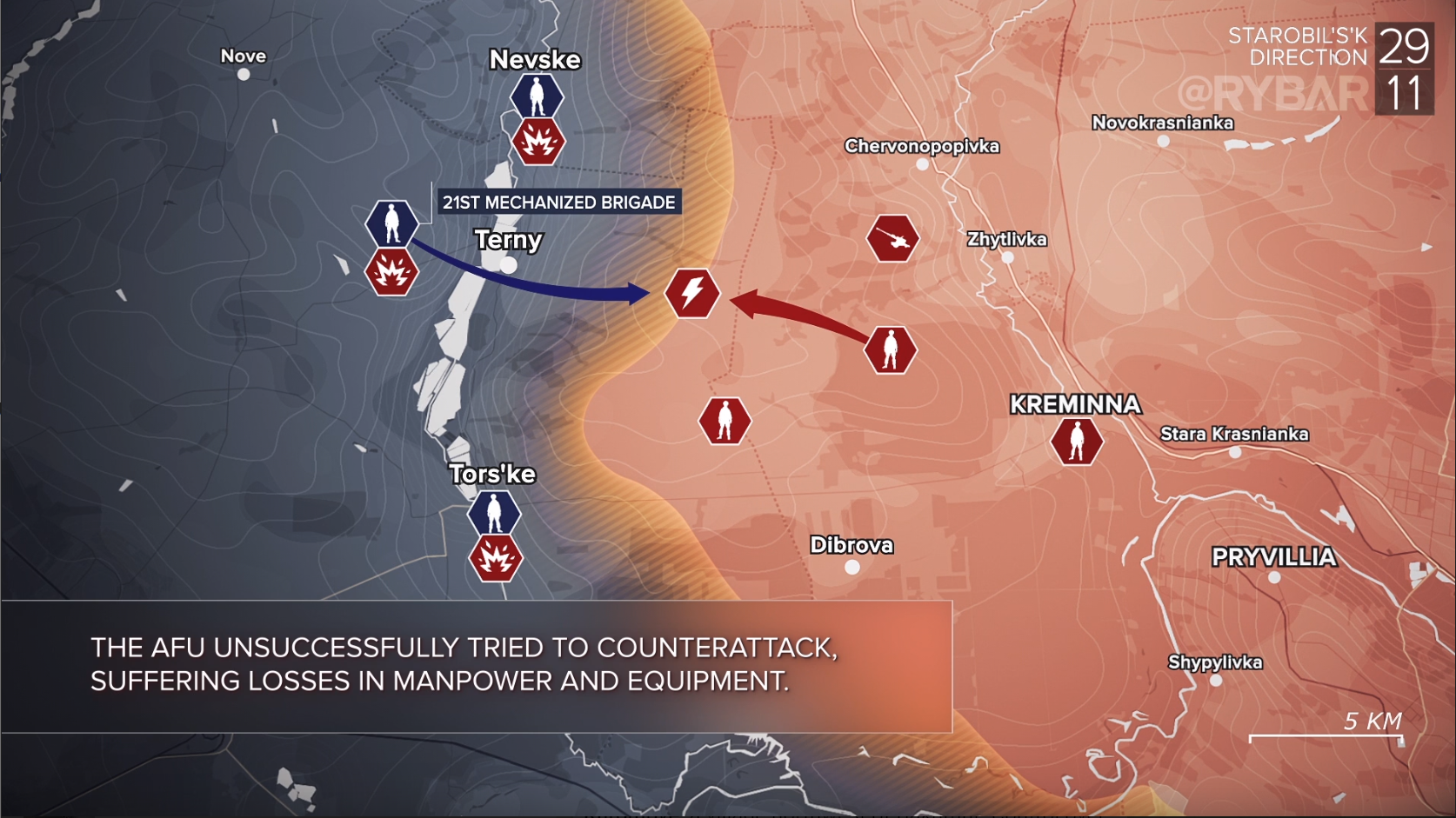 ▪️Cùng lúc gần Kreminna, RF chiếm giữ một cứ điểm của AFU ở phía đông làng Terny và đẩy lui các đợt phản công của AFU vào đây.