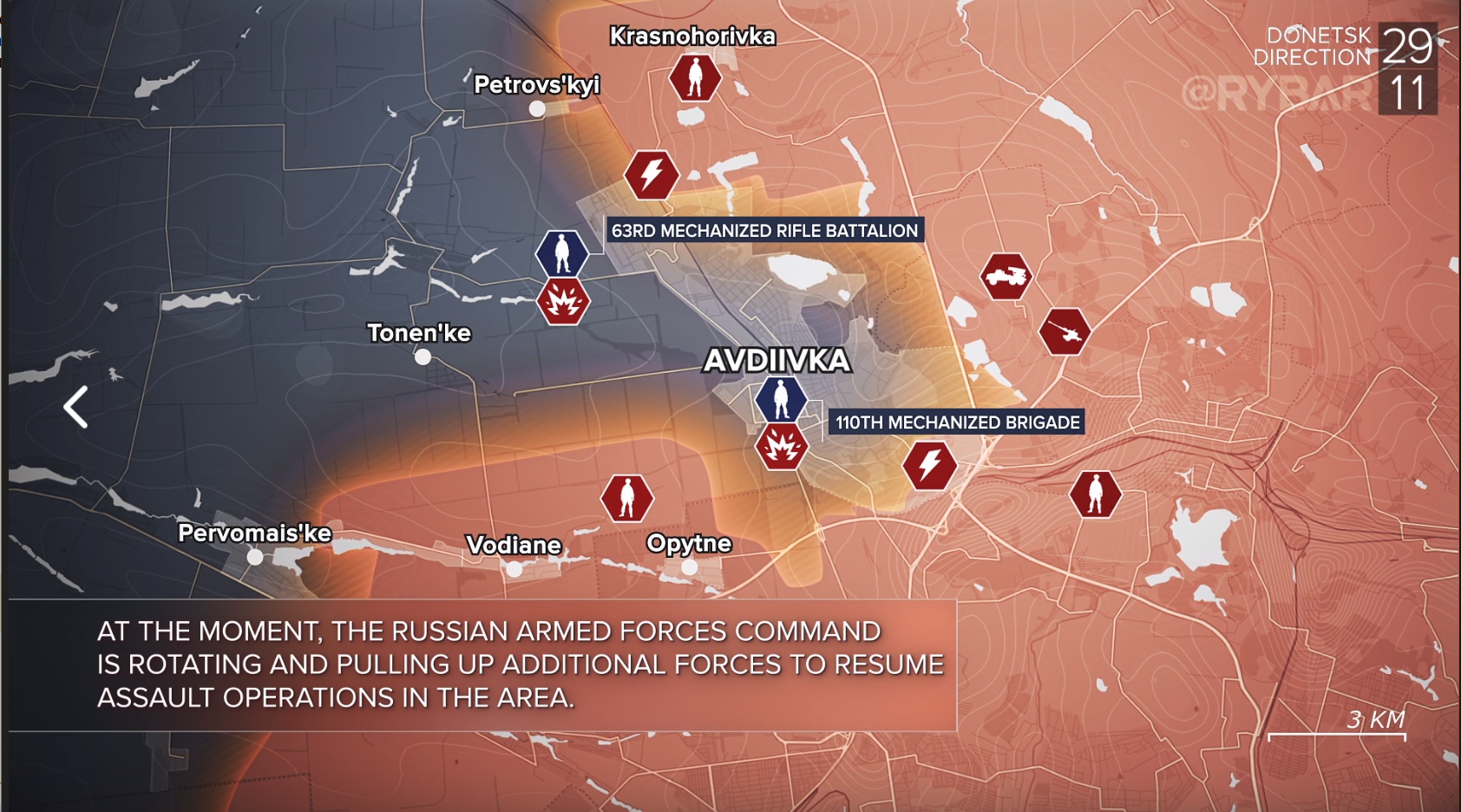 ▪️Trên hướng Donetsk, quân nhân Nga tiếp tục hoạt động bao vây khu vực kiên cố Avdeevsky. Hiện tại, Bộ chỉ huy Lực lượng Vũ trang Nga đang luân chuyển và điều động thêm lực lượng để tiếp tục các hoạt động tấn công trong khu vực.
