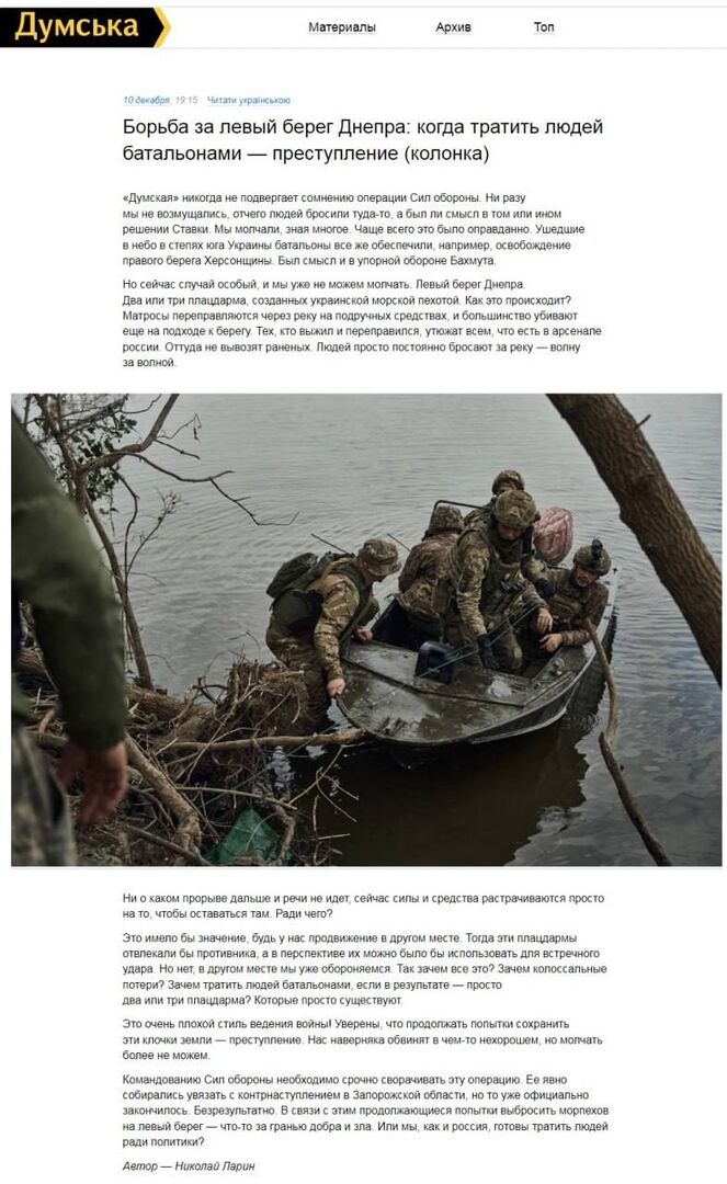 ▪️“Các thủy thủ vượt sông và hầu hết đều thiệt mạng trên đường vào bờ. Những người sống sót và vượt qua sẽ được ủi an bằng mọi thứ có trong kho vũ khí của Nga. Mọi người liên tục bị ném qua sông - hết đợt này đến đợt khác. Không còn nói đến đột phá nào nữa; bây giờ lực lượng đang bị lãng phí chỉ vì ở lại đó. Để làm gì? ▪️Điều này sẽ tạo nên sự khác biệt nếu chúng tôi quảng bá ở nơi khác. Khi đó những đầu cầu này sẽ đánh lạc hướng kẻ thù. Nhưng không, chúng tôi đã tự vệ ở một nơi khác rồi. Vậy tại sao tất cả điều này? Bộ chỉ huy cần khẩn trương cắt giảm hoạt động này. Rõ ràng nó sẽ liên quan đến cuộc tấn công ở vùng Zaporozhye, nhưng nó đã kết thúc. Về vấn đề này, những nỗ lực liên tục nhằm ném Thủy quân lục chiến sang bờ trái là một điều gì đó vượt quá thiện và ác,” Dumskaya viết. ▪️Trước đó, truyền thông phương Tây cũng đăng tải câu chuyện một quân nhân Ukraine đưa tin giao tranh ác liệt trên đầu cầu.