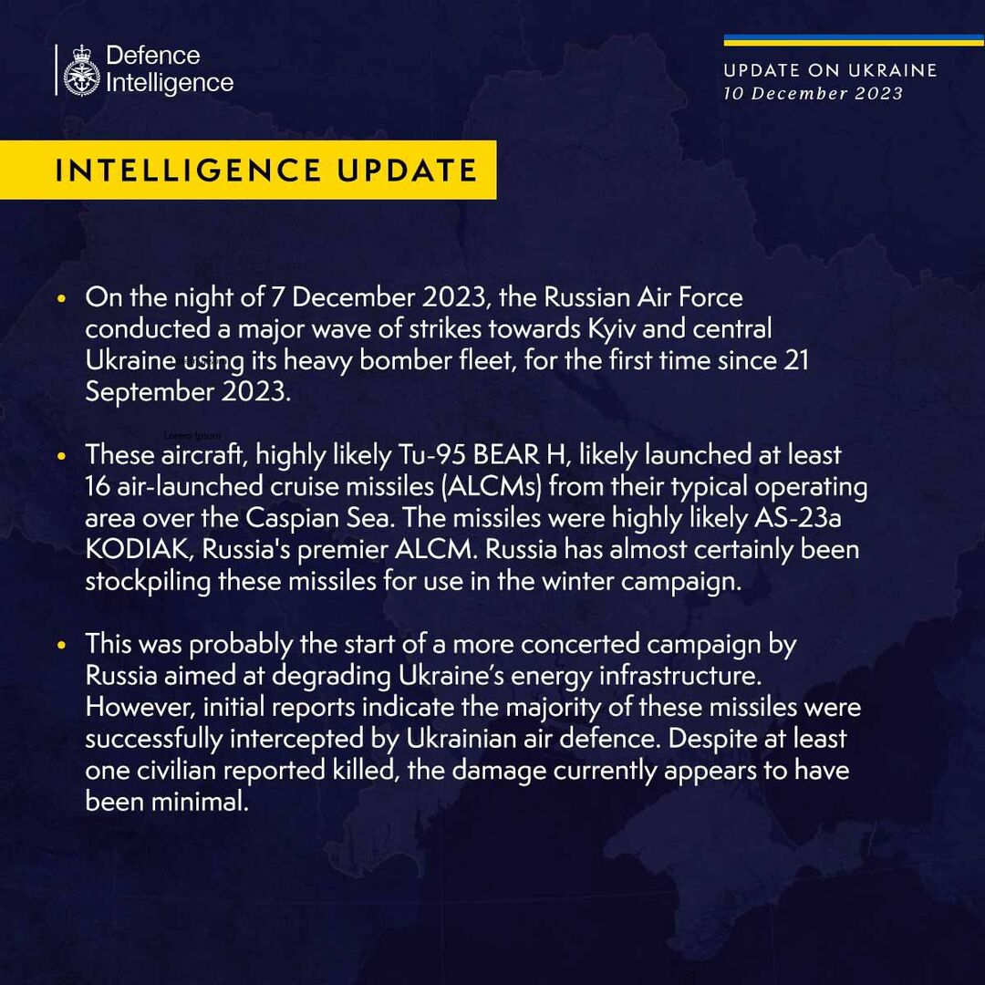 ▪️Đêm ngày 7 tháng 12 năm 2023, lần đầu tiên sau một thời gian dài, Lực lượng Hàng không Vũ trụ Nga tung ra làn sóng tấn công mạnh mẽ vào Kyiv và miền trung Ukraine bằng máy bay ném bom hạng nặng. ▪️"Những chiếc máy bay này, rất có thể là Tu-95, đã phóng ít nhất 16 tên lửa hành trình phóng từ trên không." ▪️Tình báo Anh cho rằng Nga đã dự trữ tên lửa hành trình để sử dụng trong mùa đông. ▪️ “Đây có thể là sự khởi đầu cho một chiến dịch phối hợp hơn của Nga nhằm phá hủy cơ sở hạ tầng năng lượng,” tình báo cho biết.