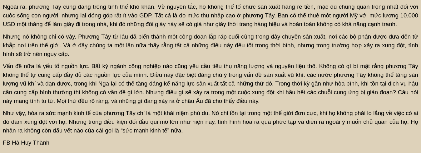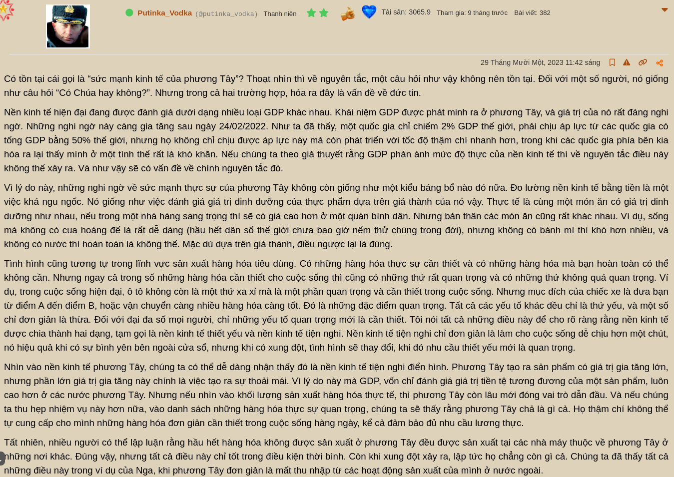 Bác Hà Huy Thành viết bài này nói đúng về đặc tính của nền kinh tế phương tây, về cái gọi là GDP, nhưng chưa đầy đủ. Sức mạnh, quyền lực kinh tế của phương tây đến từ quyền lực trong lĩnh vực tài chính, kiểm soát được hệ thống tài chính toàn cầu thông qua đồng tiền của họ làm chủ, mà những cái này có được do ưu thế sức mạnh quân sự, cũng như kiểm soát các tuyến đường và hệ thống logistics toàn cầu, từ đó dẫn đến kiểm soát được các nguồn tài nguyên, nguyên liệu thiết yếu, và từ đó dẫn đến quyền lực về tài chính đã nói