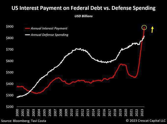 Trong 20 năm, các khoản thanh toán nợ quốc gia của Mỹ đã vượt quá ngân sách quốc phòng. Về lâu dài, nền kinh tế Mỹ bị lạm phát một cách nguy hiểm và họ cứu thế giới bằng cách in tiền và đe dọa nền kinh tế toàn cầu.