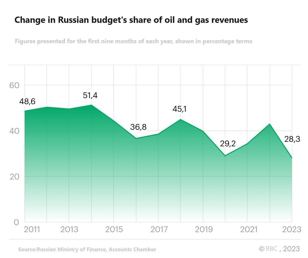 Theo một ghi chú phân tích của Phòng Tài khoản mà RBC xem được, tỷ trọng doanh thu từ dầu khí trong ngân sách của Nga đã giảm xuống dưới 29% và chiếm tới 28,3% của tất cả các khoản thu khác.