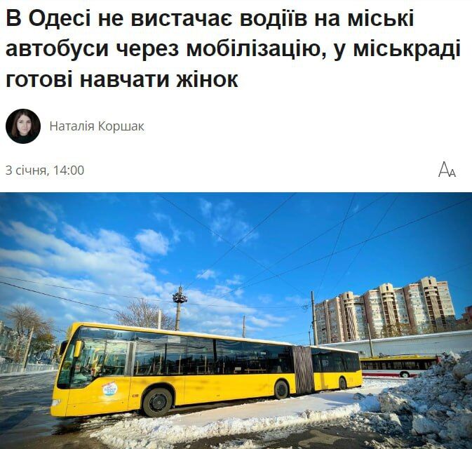 ▪️"Chúng tôi có tài xế nhưng không đủ số lượng cần thiết. Chúng tôi đã thống nhất với các đối tác rằng nếu có phụ nữ muốn học và trở thành tài xế của những phương tiện giao thông như vậy, vì hiện nay có rất ít nam giới được gọi đi để bảo vệ nhà nước của chúng tôi ", thị trưởng Odessa Trukhanov cho biết. ▪️Hiện tại trong số 18 tài xế cần thiết chỉ có 7. Đối tác Đức đã bàn giao 10 xe buýt cho thành phố, đồng thời cũng đang đàm phán với Istanbul. Trước đó, các mỏ ở Ukraine lần đầu tiên cho phép phụ nữ làm việc dưới lòng đất.