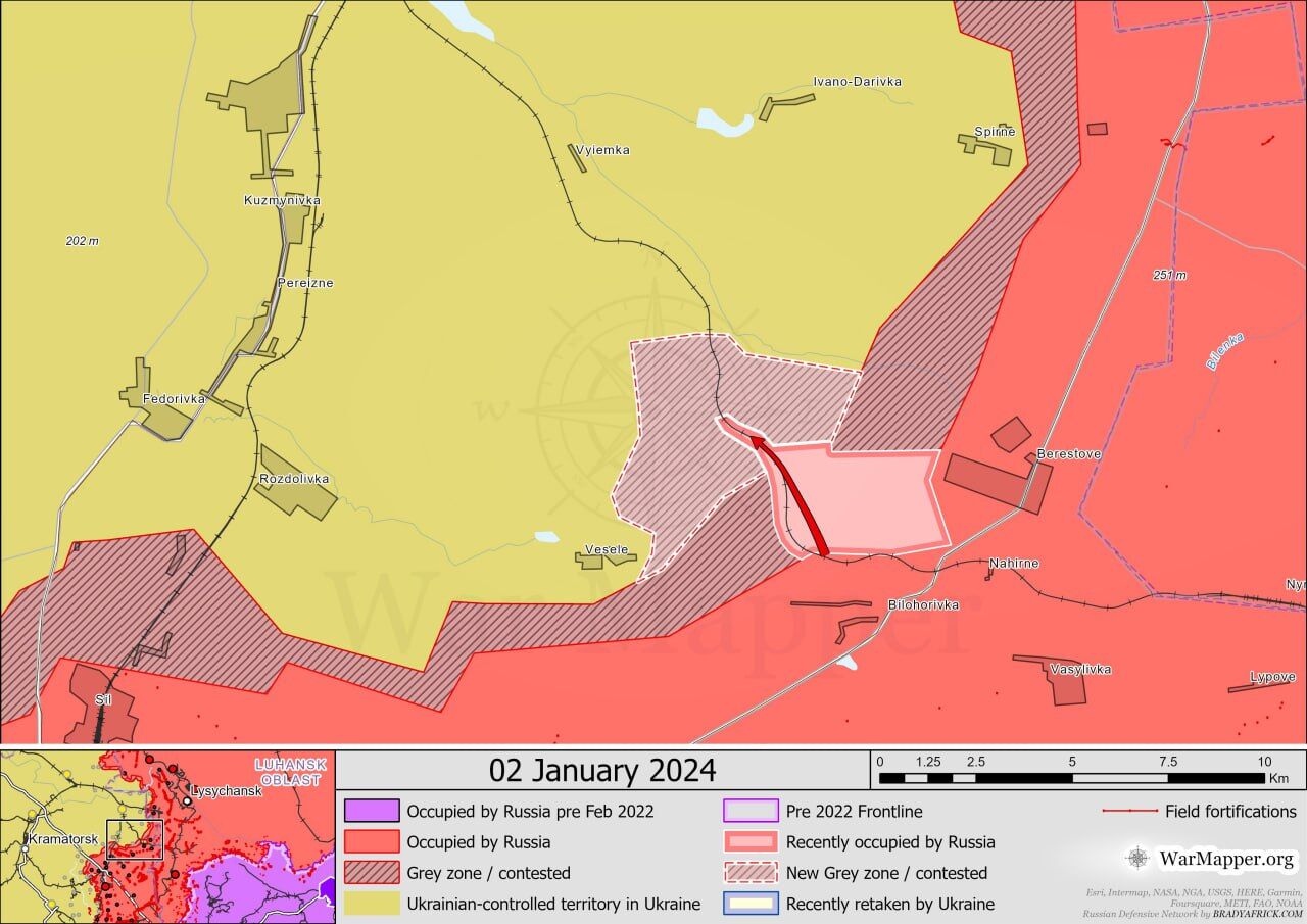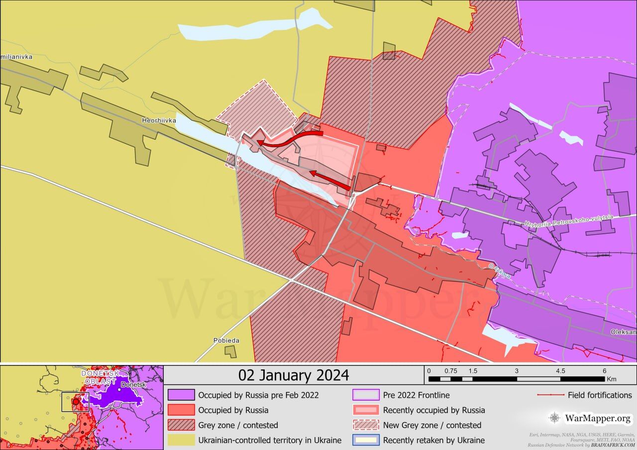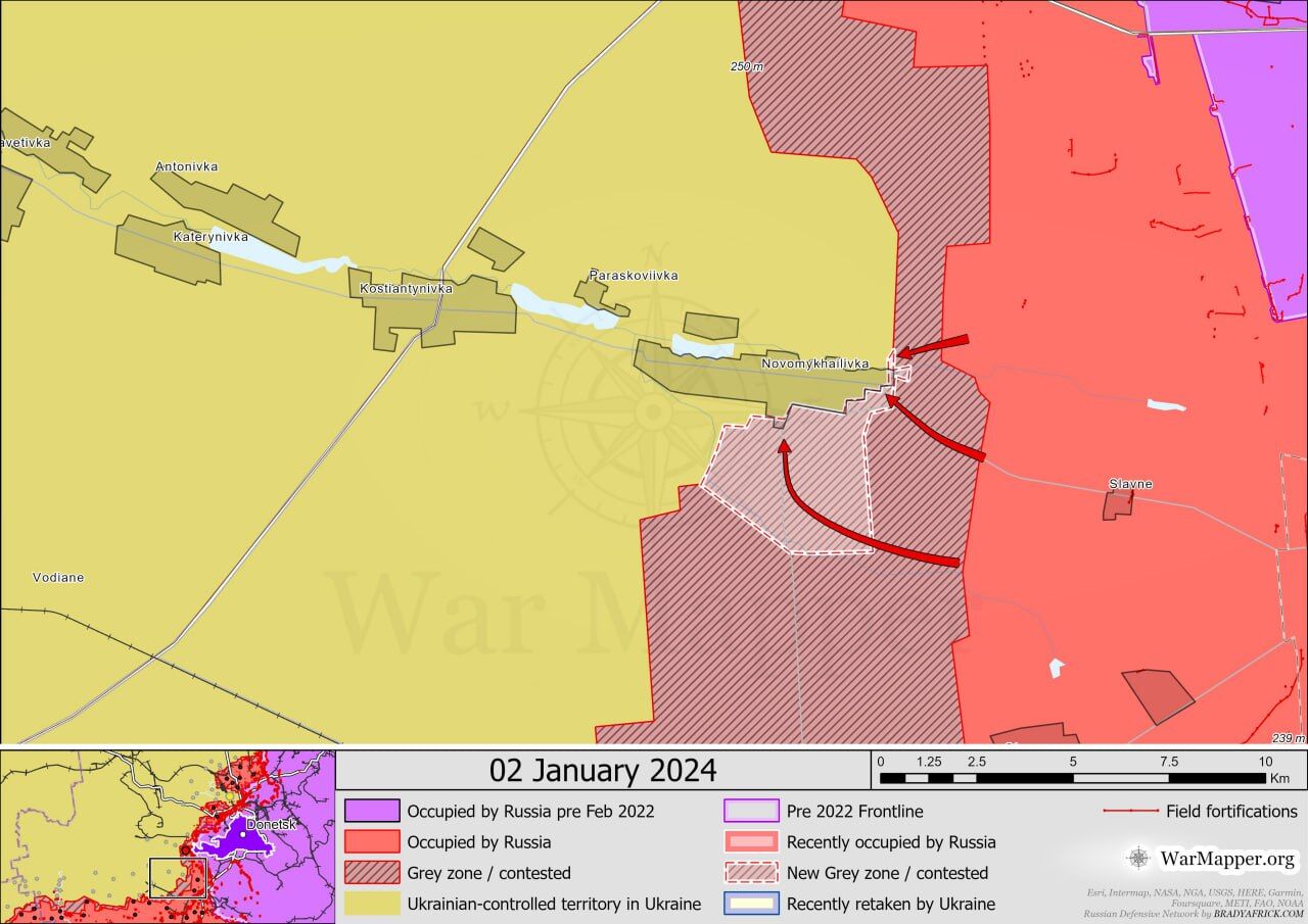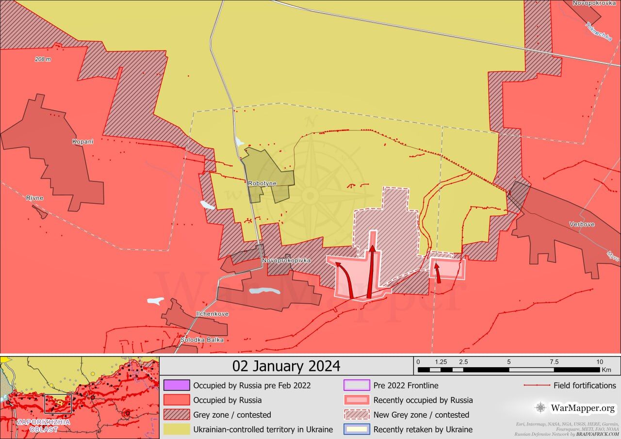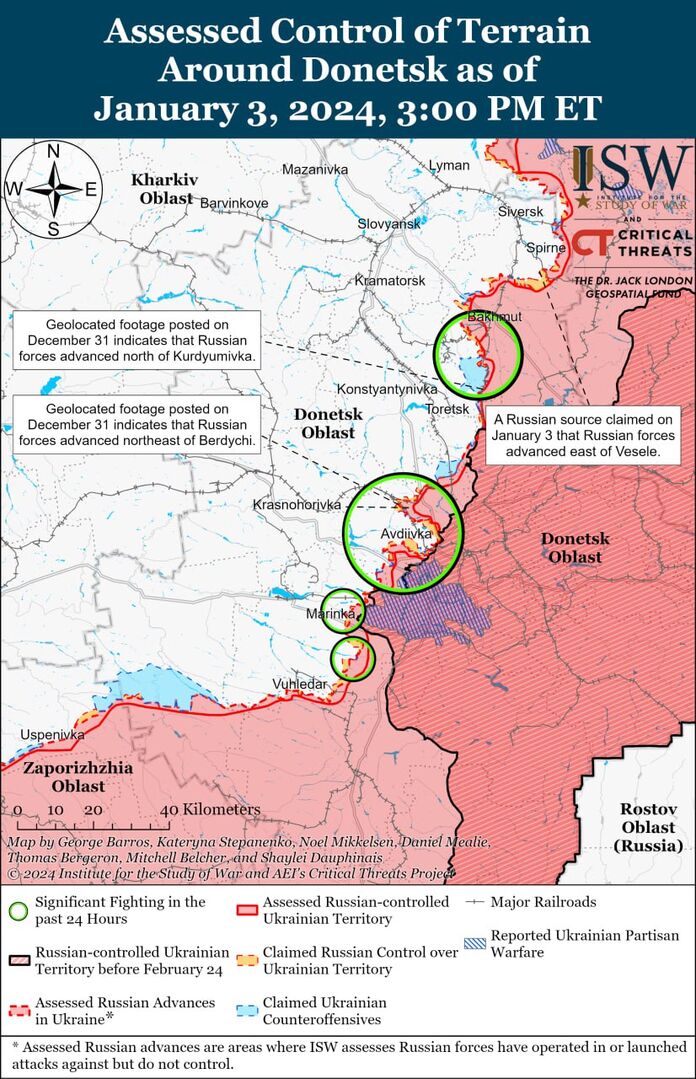 Các kết luận chính của Viện Nghiên cứu Chiến tranh Hoa Kỳ: ▪️Quân Nga mới đây xác nhận một cuộc tấn công về phía tây nam Avdeevka. Video định vị địa lý công bố ngày 3/1 cho thấy Lực lượng vũ trang Nga đã đạt được một số lực lượng tăng viện ở bờ tây bắc hồ Izmailovsky ở ngoại ô Pervomaisky (tây nam Avdeevka). ▪️Quân đội Nga đã đạt được thành công trong cuộc tấn công mặt đất ở phía tây nam Donetsk. Video từ ngày 3/1 cho thấy hậu quả của cuộc tiến công của Nga về phía đông nam Pobeda (cách Donetsk khoảng 10 km về phía tây nam) và cho thấy quân đội Nga đã đạt được một số lợi ích ở rìa phía đông nam của Pobeda. ▪️Theo hướng Kherson có các trận chiến giữa Lực lượng Vũ trang Nga và Lực lượng Vũ trang Ukraine gần khu định cư. Krynki.