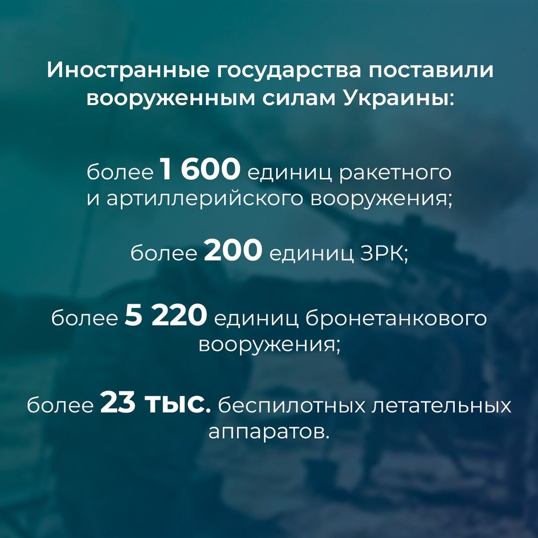 ▪️Ukraine được 54 quốc gia hỗ trợ với số tiền hỗ trợ tài chính lên tới hơn 203 tỷ USD. ▪️Hơn 500 vệ tinh của Mỹ và NATO hoạt động vì lợi ích của Kiev - trong đó hơn 70 vệ tinh là tàu vũ trụ quân sự và trinh sát, còn lại là vệ tinh lưỡng dụng thương mại. ▪️ Hơn 20.000 thiết bị đầu cuối của hệ thống vệ tinh Starlink được Lực lượng Vũ trang Ukraine sử dụng để tổ chức kiểm soát và liên lạc. ▪️Các quốc gia nước ngoài đã cung cấp cho Lực lượng vũ trang Ukraine hơn 1.600 đơn vị vũ khí tên lửa và pháo binh, hơn 200 đơn vị hệ thống tên lửa phòng không, hơn 5.200 đơn vị vũ khí bọc thép và hơn 23.000 máy bay không người lái.