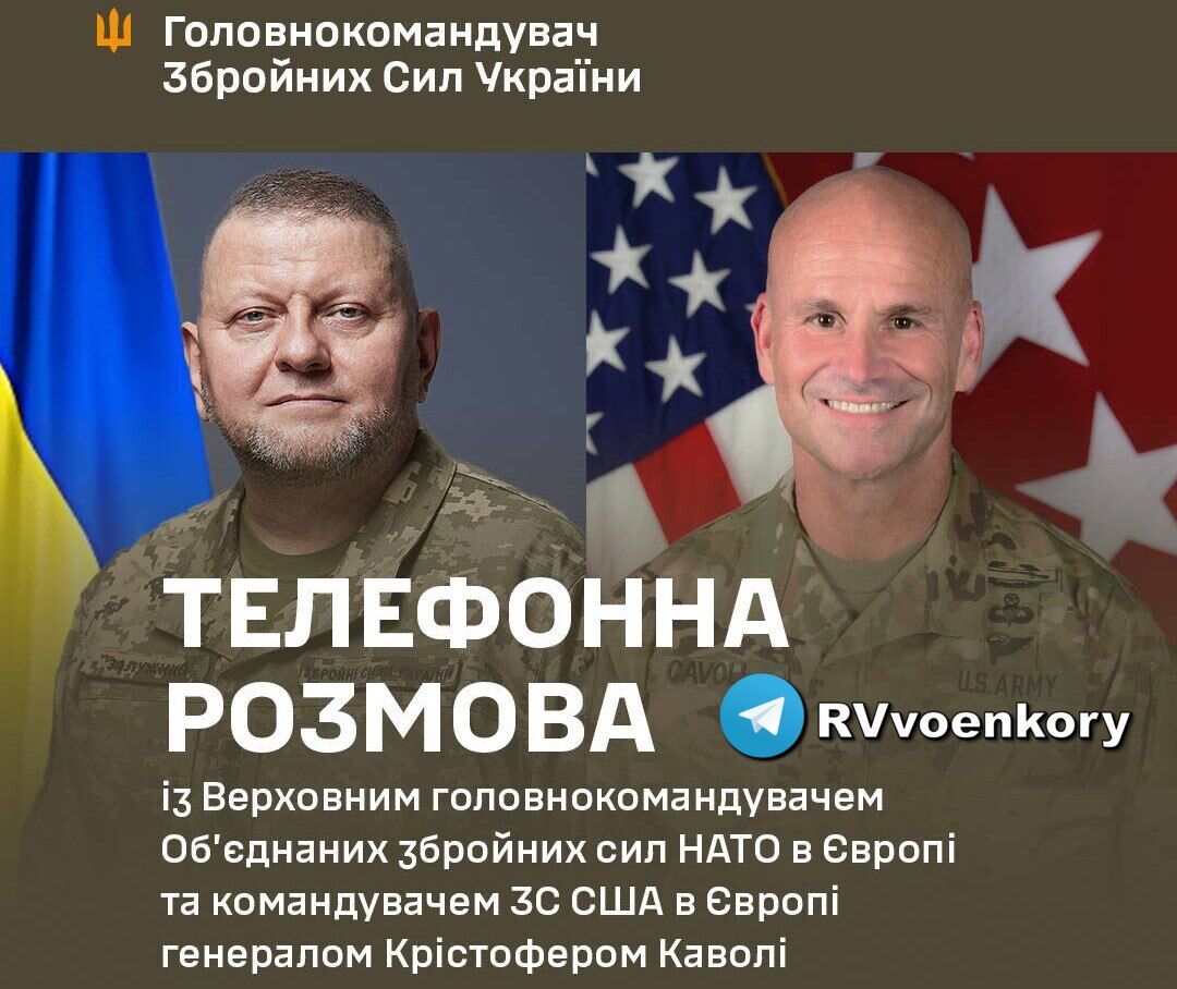 ▪️Zaluzhny nói với Tướng Christopher Cavoli rằng tình hình tác chiến-chiến lược ở mặt trận “vẫn phức tạp nhưng có thể kiểm soát được”. ▪️Lực lượng Vũ trang Ukraine “tiếp tục tiến hành các hoạt động phòng thủ, tập trung đẩy lùi các cuộc tấn công của kẻ thù và gây cho hắn tổn thất tối đa về nhân lực và trang thiết bị.” ▪️“Chúng tôi đã thảo luận chi tiết với Tướng Cavoli về những hành động có thể xảy ra của kẻ thù trong những tuần và tháng tới. Chúng tôi tập trung riêng vào vấn đề chống lại các cuộc tấn công tên lửa quy mô lớn của đối phương. Tổng tư lệnh cũng cho biết: “Tôi tập trung vào nhu cầu tăng cường hệ thống phòng không của chúng tôi.