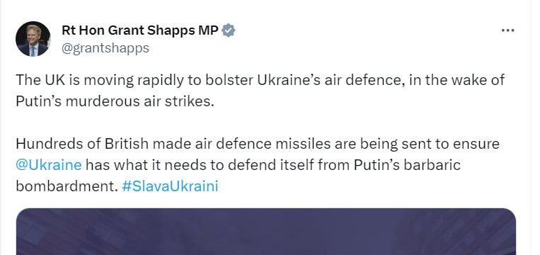 Chúng tôi tiếp tục hỗ trợ quốc phòng Ukraine. Đó là lý do tại sao hôm nay chúng tôi gửi hàng trăm tên lửa phòng không để bổ sung vào kho vũ khí của các hệ thống phòng không do Anh tài trợ có khả năng bắn hạ máy bay không người lái và tên lửa của Nga với độ chính xác đáng kinh ngạc.