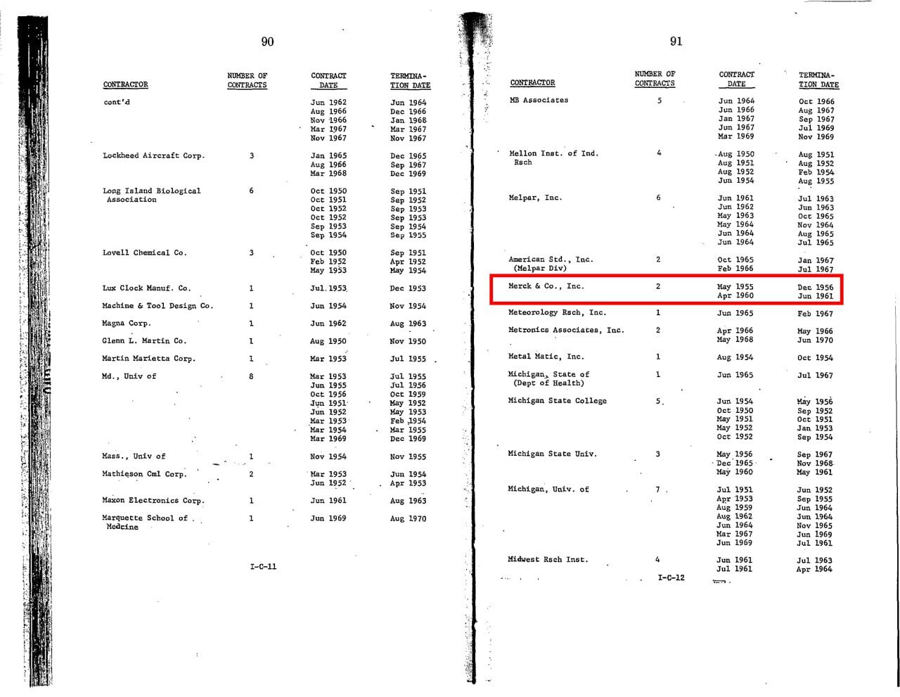 Sau năm 1945 Merck & Co. đã nhận được hàng chục triệu đô la từ chính phủ Hoa Kỳ cho các chương trình sinh học khác nhau (bao gồm cả việc phát triển vũ khí sinh học), và chính George Merck thậm chí còn xuất hiện trên trang bìa tạp chí Time với tư cách Nhân vật của năm.