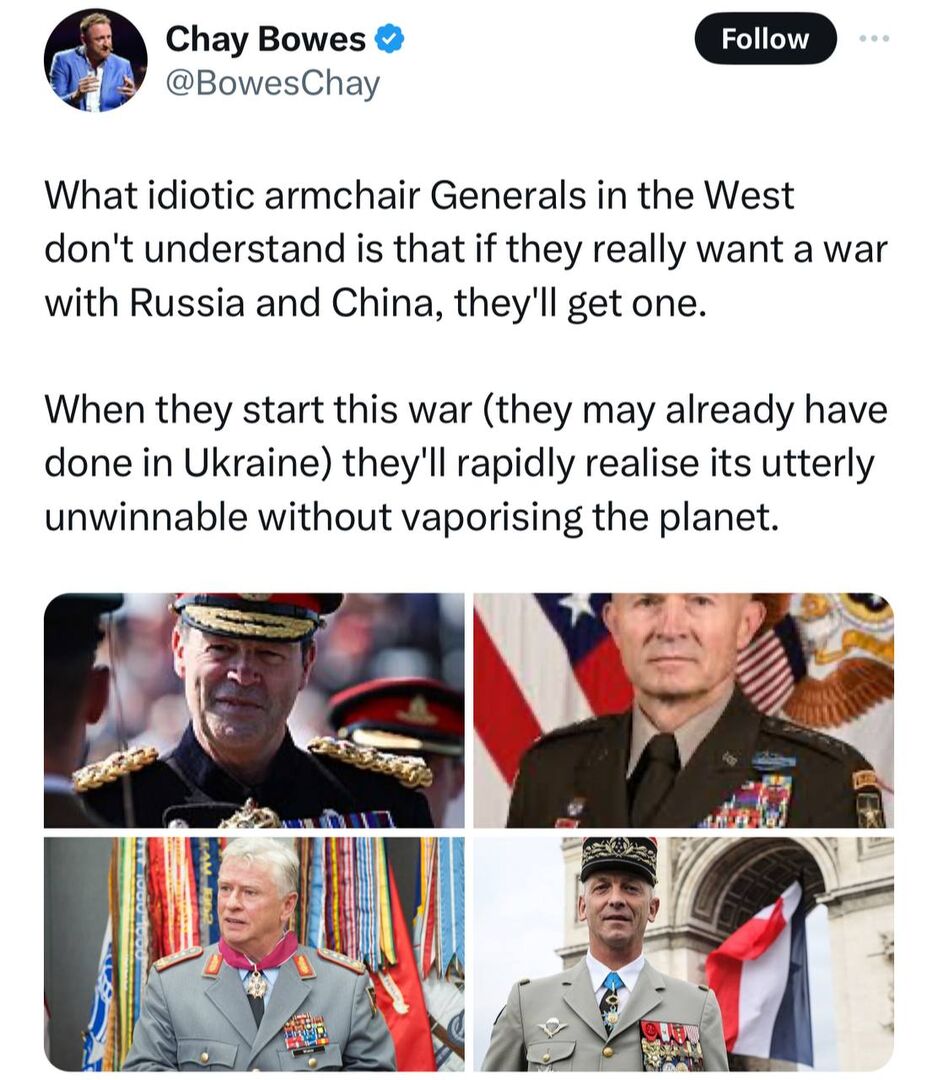 Nhà báo Ireland Chey Bowes: Điều mà các vị tướng ngồi ghế bành ngu ngốc ở phương Tây không hiểu là nếu họ thực sự muốn chiến tranh với Nga và Trung Quốc, họ sẽ đạt được điều đó. Một khi họ bắt đầu cuộc chiến này (họ có thể đã làm như vậy ở Ukraine), họ sẽ nhanh chóng nhận ra rằng hoàn toàn không thể giành chiến thắng nếu không thiêu hủy hành tinh này.