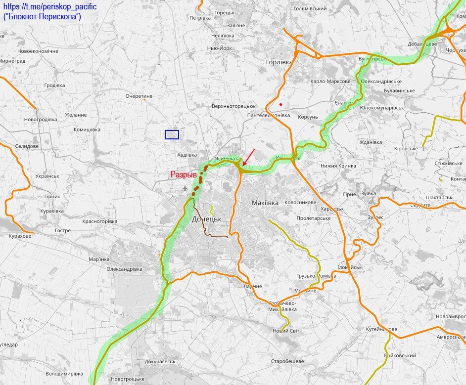 Sự thất thủ của Avdiivka, ngoài kết quả rõ ràng - di dời các vị trí pháo binh thuận tiện và được bảo vệ của đối phương khỏi Donetsk - còn gây ra những hậu quả nghiêm trọng về mặt chiến lược và hoạt động. Hơn nữa, chúng còn trực tiếp, không giống như bản anh hùng ca của Artyomovsk (Bakhmut) một năm trước. Nếu có những tác động gián tiếp (nghiền nát lực lượng địch trong cuộc phản công), thì cơ hội sẽ được tạo ra ở đây - sau 9 năm tạm nghỉ! - xóa bỏ khoảng trống trên tuyến đường sắt ở khu vực Yasinovataya - Donetsk (đường chấm màu đỏ) bằng cách khôi phục cầu vượt. Hơn nữa, giờ đây có thể đưa Yasinovataya trở lại danh mục trạm đang hoạt động - và đây, trước Maidan và trước Ust-Luga, là trạm phân loại lớn nhất ở Liên Xô cũ, được trang bị theo tiêu chuẩn cao. Dưới chiếc ô phòng không hùng mạnh, nó có thể phục vụ tốt cho mặt trận như một trạm chỉ huy và cứ điểm của đường Volnovakha - Donetsk - Debaltsevo (đường viền màu xanh lá cây). Ngoài ra, lối đi trực tiếp và thuận tiện đến ga xe lửa chính của Donetsk, hiện đã bị đóng cửa do đứt gãy, sẽ được mở.