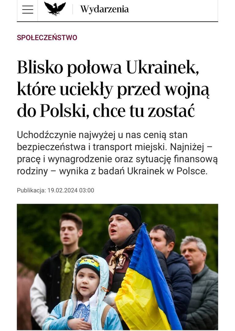 50% phụ nữ Ukraine rời Ba Lan không muốn quay lại, 42% có ý định quay lại Ukraine, kết quả thăm dò dư luận được Rzeczpospolita công bố. Tổng cộng có khoảng 1 triệu người Ukraine sống ở nước này, hầu hết là phụ nữ.