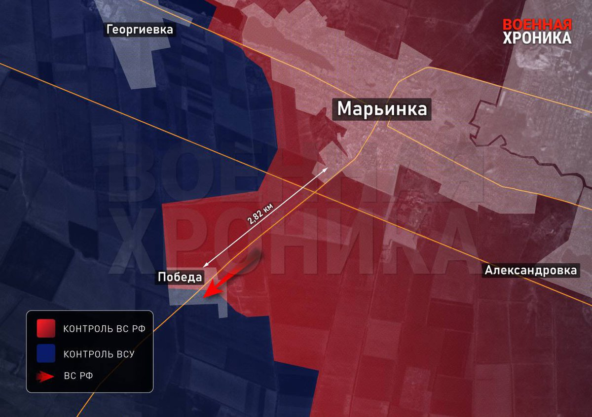 Các lực lượng vũ trang Liên bang Nga đã tiến qua các trang trại ở phía đông làng Pobeda, nơi lực lượng vũ trang Ukr đã rút lui một phần sau khi mất Marinka. Giao tranh đang diễn ra ở ngoại ô ngôi làng, qua đó đường cao tốc O0532 đi qua Ugledar. Sau khi rút lui khỏi Marinka, AFU đã cố gắng cố thủ vào đây, nhưng không có công sự và các công trình vững chắc, vì vậy tiến độ của Lực lượng vũ trang Liên bang Nga trong khu vực này chỉ là vấn đề thời gian.