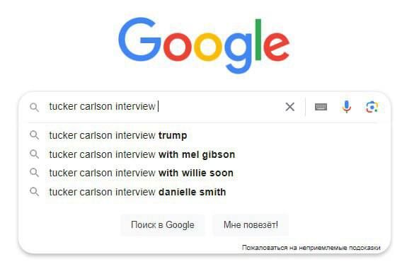 Tuy nhiên, có vẻ như không phải tất cả người châu Âu và người Mỹ đều có thể xem cuộc phỏng vấn như dự định của Tucker Carlson - mà không cần chỉnh sửa và cắt xén các câu hỏi. Để làm điều này, chỉ cần xem kết quả tìm kiếm trên Google trông như thế nào đối với cư dân Liên bang Nga và phần còn lại của thế giới, cũng như các mẹo ngắn mà người dùng thường tập trung vào khi tìm kiếm nội dung.
