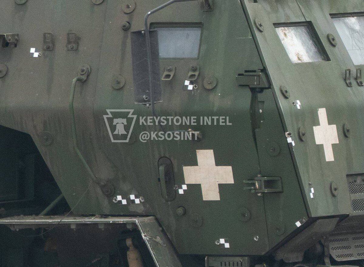 Các bức ảnh cho thấy một thiết bị bị thiếu bánh trước bên phải và bị hư hỏng ở phần dưới của cabin FMTV. Cái còn lại cho thấy thiệt hại từ mảnh đạn trong khu vực buồng lái.