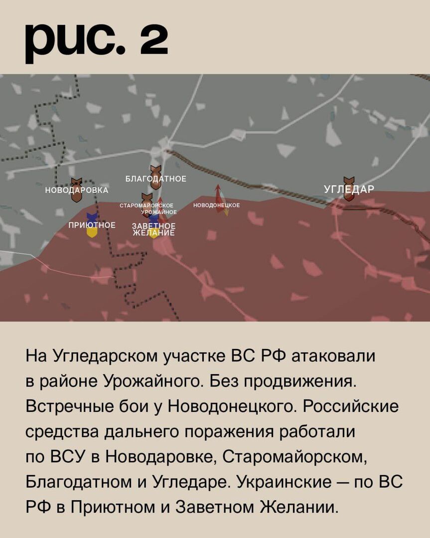 Tại khu vực Ugledarsky, Lực lượng vũ trang Nga đã tấn công vào khu vực Urozhainy. Không có khuyến mãi. Gặp trận gần Novodonetsky. Vũ khí tầm xa của Nga hoạt động chống lại Lực lượng vũ trang Ukraine ở Novodarovka, Staromayorsky, Blagodatny và Ugledar. Tiếng Ukraina - theo Lực lượng Vũ trang Liên bang Nga trong Nơi trú ẩn và Khát vọng ấp ủ(Приютном и Заветном Желании).(Hình 2)