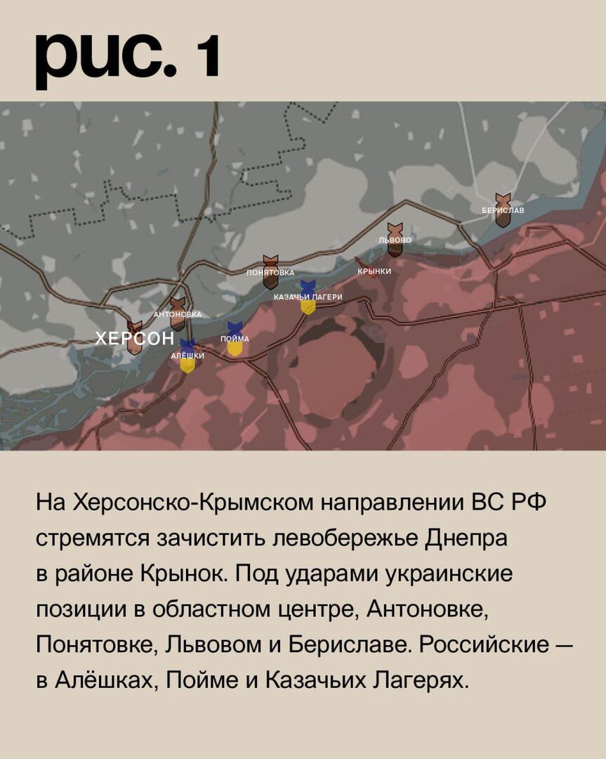 Theo hướng Kherson-Crimean, Lực lượng vũ trang Nga đang cố gắng giải tỏa bờ trái sông Dnieper ở khu vực Krynok. Các vị trí của Ukraina ở trung tâm khu vực, Antonovka, Poniatovka, Lvov và Berislav đang bị tấn công. Tiếng Nga - ở các trại Aleshki, Poima và Cossack. (Hình 1)