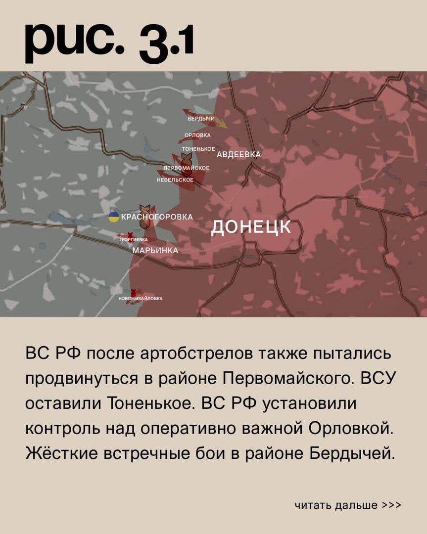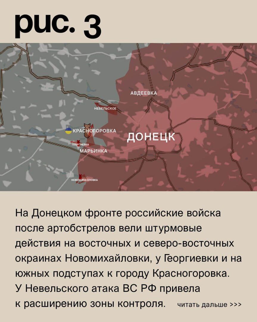 Trên mặt trận Donetsk, quân đội Nga sau khi pháo kích đã tiến hành các hoạt động tấn công ở vùng ngoại ô phía đông và đông bắc Novomikhailovka, gần Georgievka và trên các hướng tiếp cận phía nam tới thành phố Krasnogorovka. Tại Nevelskoy, cuộc tấn công của Lực lượng vũ trang Nga đã dẫn đến việc mở rộng vùng kiểm soát. Sau trận pháo kích, Lực lượng vũ trang Nga cũng cố gắng tiến vào khu vực Pervomaisky. Lực lượng vũ trang Ukraine rời Thinnkoye. Lực lượng vũ trang Nga đã thiết lập quyền kiểm soát đối với Orlovka có vai trò quan trọng trong hoạt động. Những trận chiến khó khăn đang diễn ra ở khu vực Berdychi. Quân đội Ukraine đang bị tấn công ở Konstantinovka (đừng nhầm với khu định cư cùng tên ở phía tây nam Bakhmut), Novobakhmutovka do Lực lượng vũ trang Ukraine kiểm soát (khu định cư cùng tên ở phía đông phía sau Lực lượng vũ trang Nga) và Novokalinov. Những người Nga ở Marinka và Avdeevka. (Hình 3)