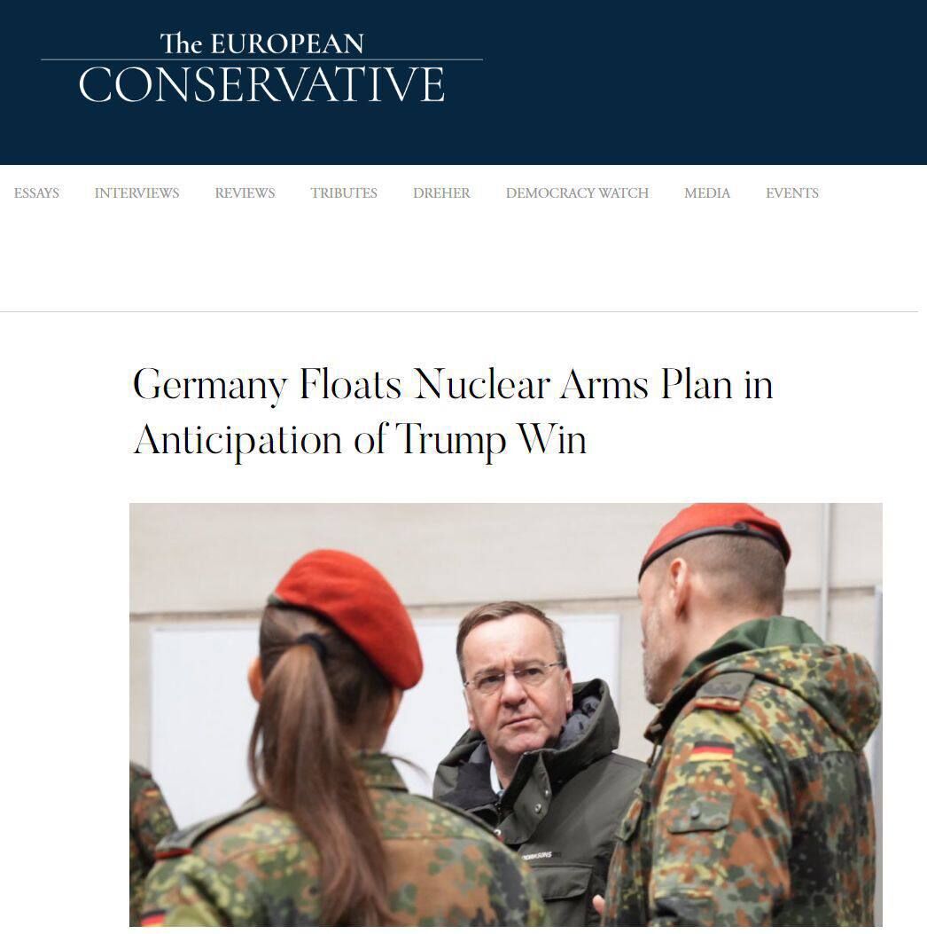 Đảng Bảo thủ Châu Âu viết về điều này, trích dẫn lập luận của The Wall Street Journal. Họ đang tiến hành đối thoại với Pháp và Anh. Một số chính trị gia Đức đang kêu gọi chính quyền không dựa vào Mỹ trong việc răn đe hạt nhân. Bản thân người dân Đức đã trở nên khoan dung hơn với loại vũ khí này.