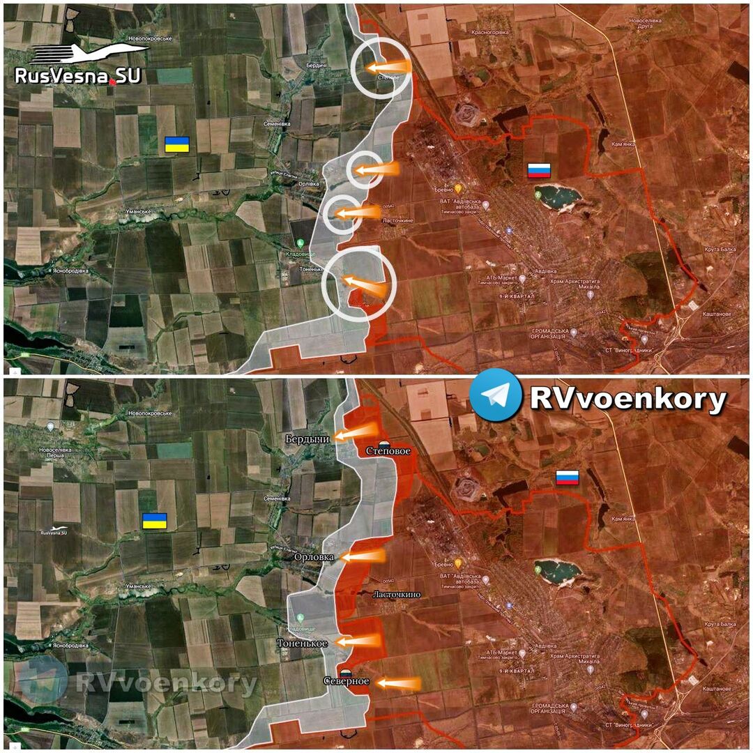 ▪️“Tốc độ cao của các hoạt động quân sự vẫn diễn ra theo hướng Avdeevsky. Quân Nga chiếm được làng Stepovoye. Nâng cao một đoạn có chiều rộng lên tới 2,68 km và độ sâu 1,1 km.