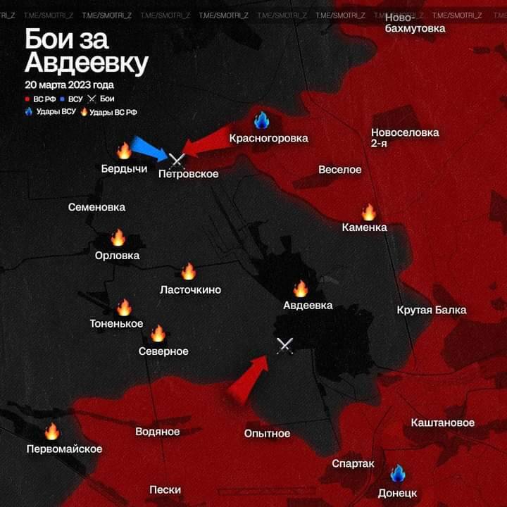 Các nguồn tin Ukraine thừa nhận rằng một tình huống nguy cấp cũng đã phát triển ở Avdeevka, nơi Lực lượng vũ trang Nga đã có thể đột phá khỏi Krasnogorovka và giành quyền kiểm soát Petrivske (Stepovoye), đồng thời tấn công làng Berdichi. Cũng có thông tin cho rằng khu xỉ thải ở phía bắc Avdiivka, có độ cao vượt trội so với toàn bộ thành phố và các vùng lãnh thổ lân cận, sẽ sớm bị chiếm (có thể đã bị chiếm), điều này sẽ khiến quân đồn trú Bandera rơi vào tình thế vô vọng.