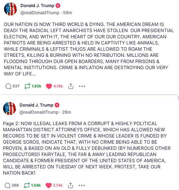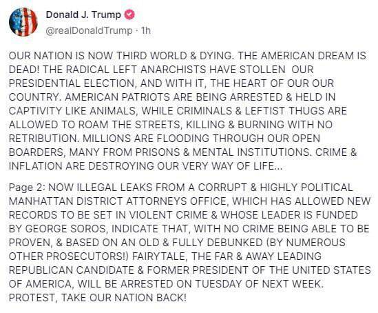 Trump mũ kêu gọi toàn dân vùng lên phản đối chế độ đẫm máu Biden: Đất nước ta giờ thuộc thế giới thứ 3 và nát bét. Giấc mơ Mỹ đã chết! Những người theo chủ nghĩa vô chính phủ cánh tả cực đoan đã đánh cắp các cuộc bầu cử tổng thống của chúng ta và cùng với họ là trái tim của đất nước chúng ta. Những người Mỹ yêu nước bị bắt và trở thành mục tiêu bị giam cầm như động vật, trong khi bọn tội phạm và côn đồ cánh tả được phép lang thang trên đường phố, giết và đốt mà không bị trừng phạt. Hàng triệu người đã tràn qua biên giới rộng mở của chúng ta, nhiều người trong số họ đến từ các nhà tù và bệnh viện tâm thần. Tội phạm và lạm phát phá hủy lối sống của chúng ta. Giờ đây, những rò rỉ bất hợp pháp từ văn phòng Biện lý Quận Manhattan tham nhũng và chính trị hóa cao, nơi sẽ lập nên những hồ sơ tội phạm bạo lực mới và người đứng đầu được tài trợ bởi George Soros, cho thấy rằng, mặc dù thực tế là không có tội ác nào có thể được chứng minh, và trên cơ sở của câu chuyện cũ và hoàn toàn bị lật tẩy (bởi nhiều công tố viên khác!), ứng cử viên hàng đầu mạnh mẽ và cựu tổng thống Hoa Kỳ sẽ bị bắt vào thứ Ba tuần sau. Biểu tình, giành lại đất nước của chúng ta!