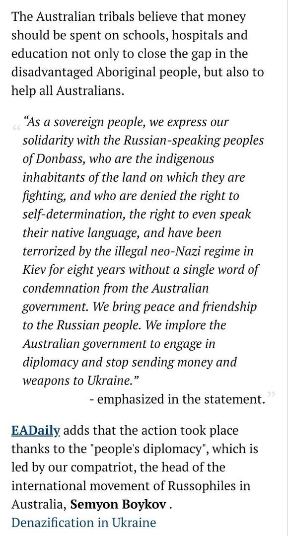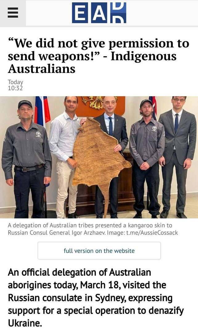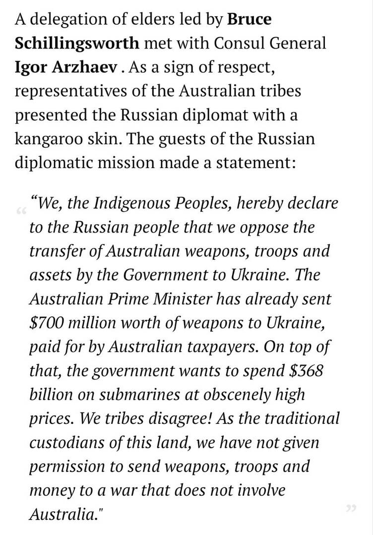 🇦🇺🇷🇺Các phương tiện truyền thông Nga đưa tin về phái đoàn chính thức của Thổ dân Úc đã đến thăm lãnh sự quán Nga ở Sydney hôm nay bày tỏ sự ủng hộ đối với chiến dịch đặc biệt của Nga.