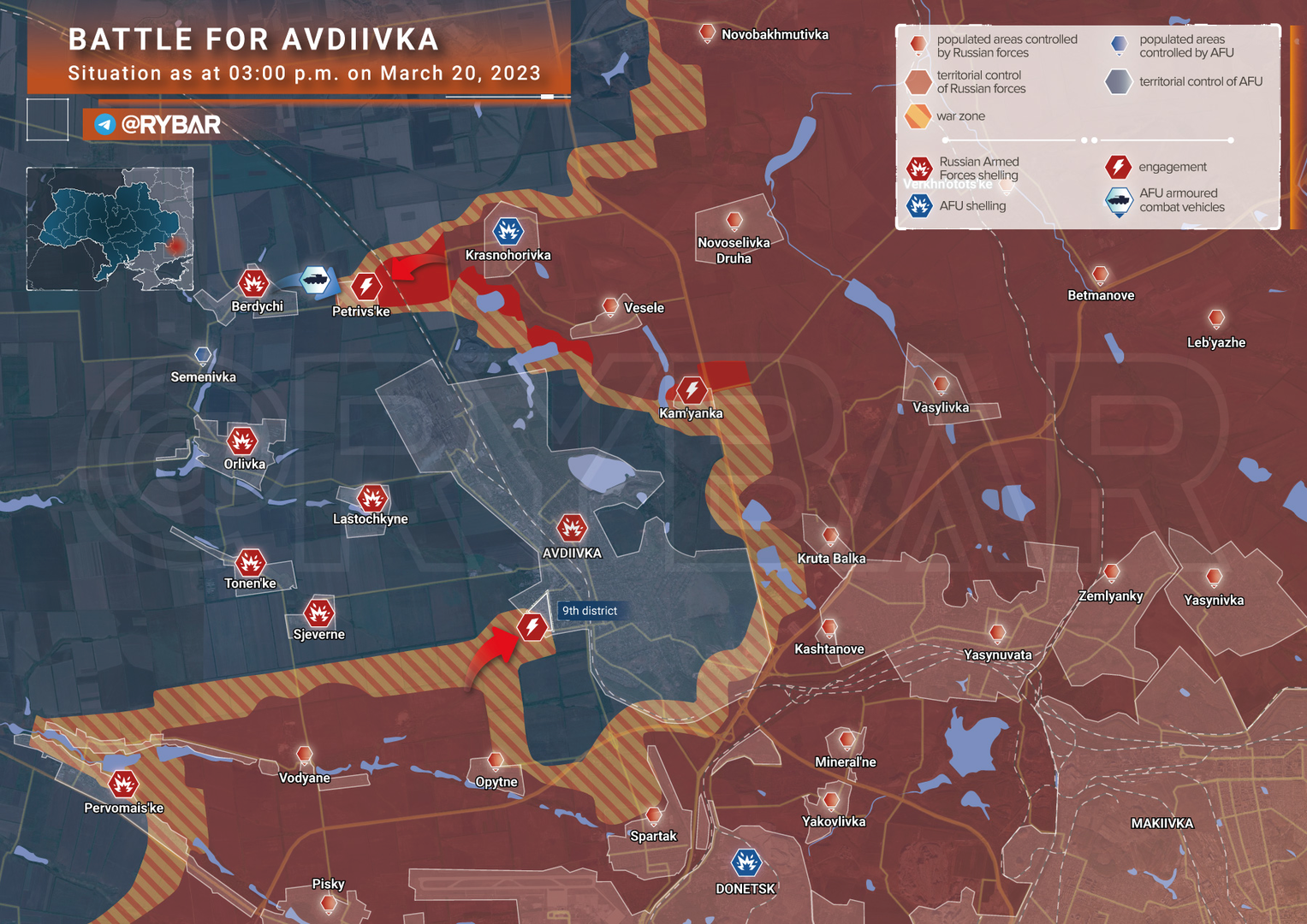 Trong ba tuần qua, các lực lượng Nga đã tiến dần dần xung quanh Avdiivka;“Chiến dịch của Nga chủ yếu được thực hiện bởi Quân đoàn 1 của DPR, những chiến binh địa phương có kiến thức tốt về khu vực. Avdiivka đã trở thanh tuyến phòng thủ từ năm 2014; thành phố hiện đã bị phá hủy phần lớn. Tổ hợp nhà máy luyện cốc Avdiivka có khả năng trở thành một khu vực trọng điểm, đặc biệt thuận tiện để phòng thủ khi chiến sự phát triển," báo cáo mới nhất viết.