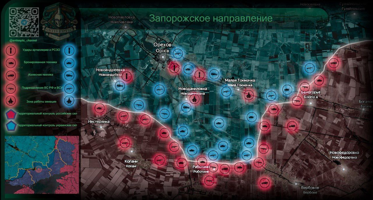 Khu vực Zaporozhye vẫn là địa điểm chiến đấu hạng nặng, chủ yếu theo vị trí sử dụng máy bay không người lái FPV. Các hoạt động chiến đấu tích cực với sự hỗ trợ của các phương tiện tầm xa vẫn tiếp tục diễn ra tại làng Rabotino từ cả hai phía. Phía bắc Verbovo, Lực lượng vũ trang Nga đang tiến hành các hoạt động tấn công nhằm vào các vị trí của Lực lượng vũ trang Ukraine, với một số thành công nhỏ. Cụ thể, 3 cứ điểm đã bị chiếm và 2 trạm tác chiến điện tử bị phá hủy.