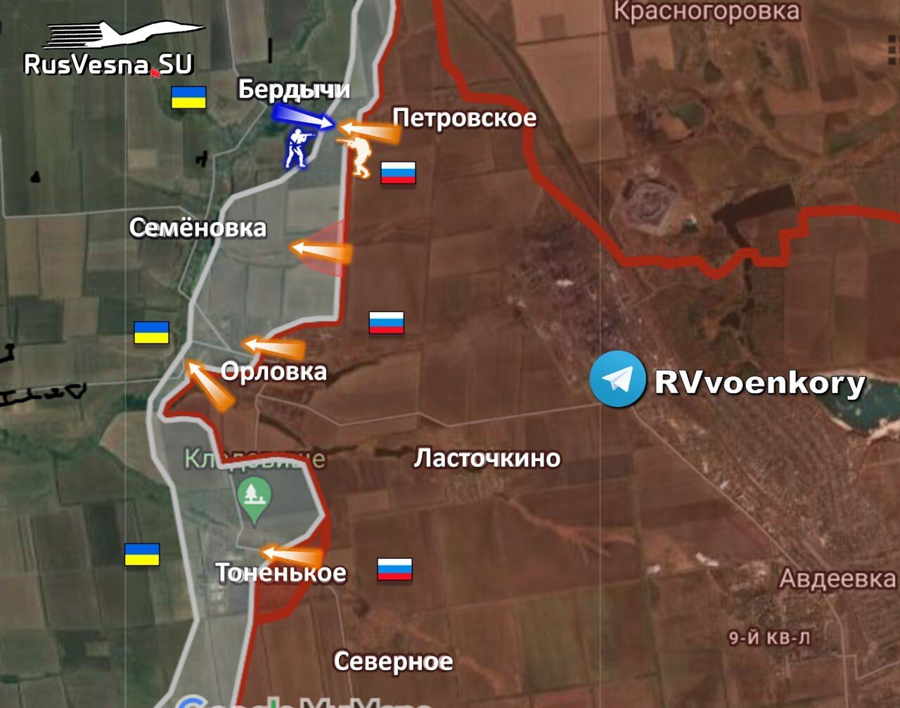 “🅾️valiant” tấn công Berdychi, Orlovka và Tonenkoe, tiếp tục cuộc tấn công vượt ra ngoài Avdeevka ▪️Các lực lượng của Cụm “Trung tâm” cùng các đơn vị trực thuộc của Quân đoàn 1 tiếp tục tấn công vào tuyến phòng thủ mới của địch sau khi giải phóng Avdeevka, Lastochkino và Severny. ▪️Phía tây Avdeevka diễn ra các trận chiến khốc liệt suốt ngày đêm ở các khu vực Orlovka, Tonenkoye và Berdychi. Những ngày này, 10 lực lượng địch hỗ trợ trên địa bàn đang tất bật trồng trọt, xây dựng. ▪️Ngoài ra, lực lượng Quân khu Trung tâm cũng bắt đầu tiến về phía Semyonovka. ▪️Các nhà tuyên truyền quân sự Ukraine báo cáo dữ liệu của họ về các cuộc tấn công của Lực lượng Vũ trang Nga: ▪️"Người Nga đang tăng cường lực lượng tấn công Berdychi. Các khu vực Orlovka và Tonenky vẫn nằm dưới sự kiểm soát của Lực lượng vũ trang Ukraine. Có những nỗ lực phản công." ▪️"Phía nam Orlovka, quân Nga tiến vào khu vực rộng tới 1,27 km và sâu 500 m. Gầy." ▪️"Ở phía tây bắc Tonenky, quân Nga đã tiến tới độ sâu 1,35 km", Lực lượng vũ trang Ukraine đang cố gắng phản công. ▪️Tại Berdychi đang diễn ra các trận giao tranh ác liệt dọc Phố Mira, Lực lượng Vũ trang Ukraine đang cố gắng phản công nhằm đẩy Lực lượng Vũ trang Nga ra khỏi khu vực phía đông bắc. ▪️Lực lượng vũ trang Nga đang tiến về phía Nevelskoye, tiến đến vùng ngoại ô của ngôi làng. ▪️Quân của chúng tôi cũng đang tấn công Pervomayskoye - đã chiếm hơn một nửa ngôi làng. ▪️VKS Nga tiếp tục bao vây các vị trí của Lực lượng vũ trang Ukraine với hàng chục chiếc KAB, kẻ thù phàn nàn.