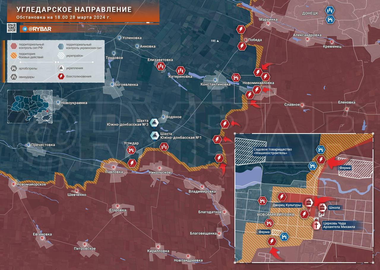 Ở khu vực Ugledar, Lực lượng vũ trang Nga đã nắm quyền kiểm soát Cung Văn hóa và trường học ở Novomikhailovka, với các cuộc chiến giành hội đồng làng đang diễn ra. Hiện nay, các phân đội tiền phương đang tập trung lại ở trung tâm làng trên đường Lênin.