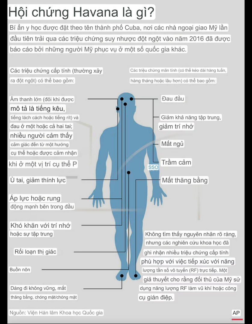 Hội chứng Havana lần đầu tiên được ghi nhận năm 2016- gây hiện tượng đau đầu, ảnh hưởng đến thị giác và thính giác của các nhân viên ngoại giao Mỹ ở Cuba, tiếp đó là nhân viên ngoại giao Canada, Mỹ ở một loạt SQ trên thế giới.