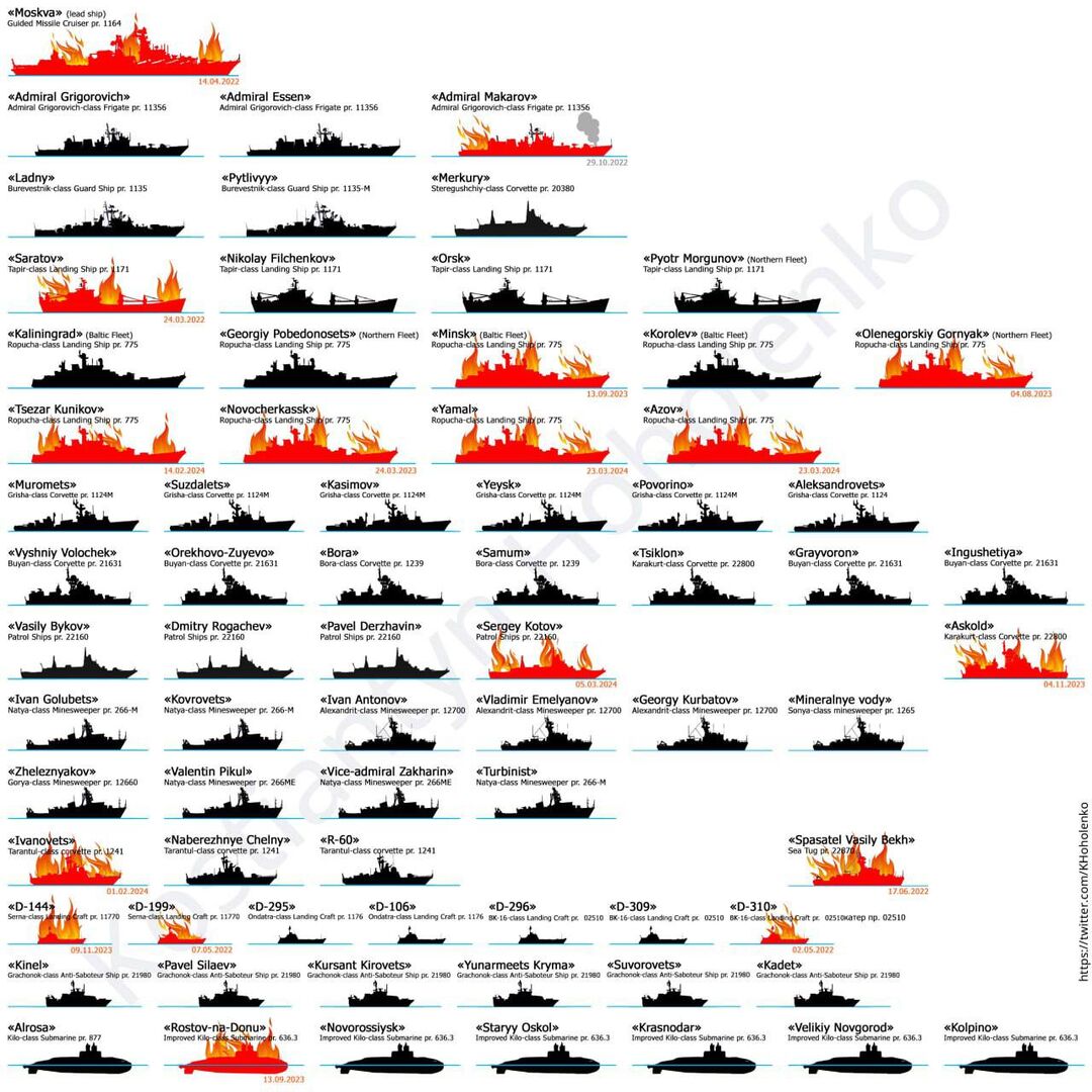 Đồ họa ở dưới cho biết thêm các chi tiết về số lượng và cơ cấu chủng loại tàu của Hạm đội, cùng thông tin tàu nào đã bị tấn công phá hủy vào thời gian nào (kể từ sau 2/2022).