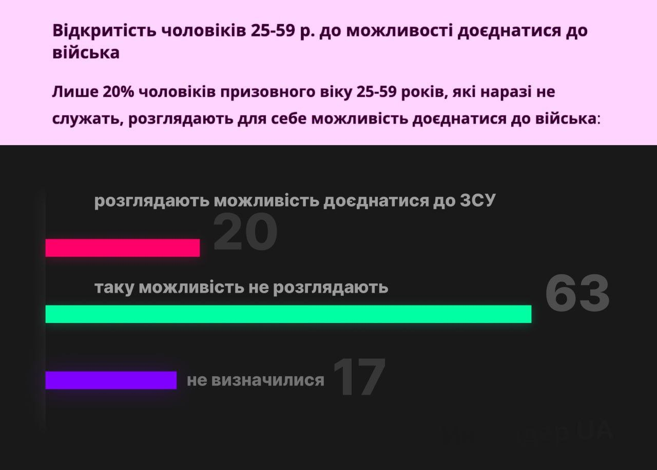 Chỉ 20% người Ukraine trong độ tuổi nhập ngũ đang xem xét cơ hội gia nhập Lực lượng vũ trang Ukraine. 24% kiên quyết không gia nhập quân đội, - Suspilne