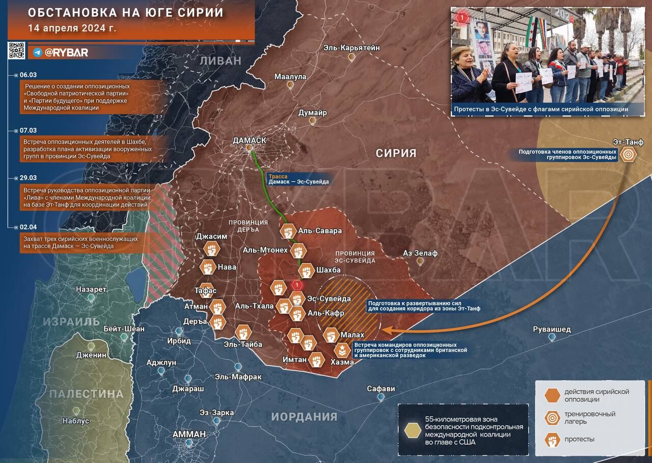 ▪️Vào cuối tháng 3, các lãnh đạo đảng đối lập Al-Liwaa hoạt động trên địa bàn tỉnh đã đến khu Al-Tanf. Tại cuộc gặp với các sĩ quan Mỹ, họ đã nhận được hướng dẫn về cách chống lại những người theo đạo Hồi trung thành với chính phủ Syria và phần thưởng trị giá 100 nghìn đô la.