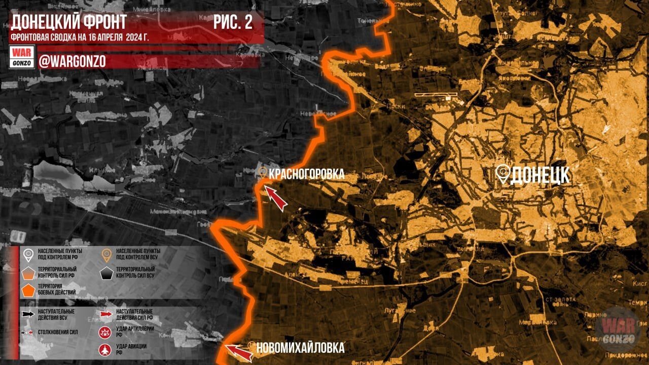 Mặt trận Donetsk. Tại khu vực Novomikhailovka, các hành động tấn công tích cực của Lực lượng Vũ trang Nga đang đẩy Lực lượng Vũ trang Ukraine ngày càng xa hơn về phía Tây. Ở vùng ngoại ô phía nam của Krasnogorovka, nhờ các hoạt động tấn công, quân đội Nga cũng đã cải thiện được vị trí của mình. Tại Semyonovka, Lực lượng vũ trang Nga đã tiến công và tạo dựng được chỗ đứng trên một khu vực rộng lớn trong khu dân cư. Có những bước tiến về phía bắc Berdychi về phía Novobakhmutovka. (Hình 2)