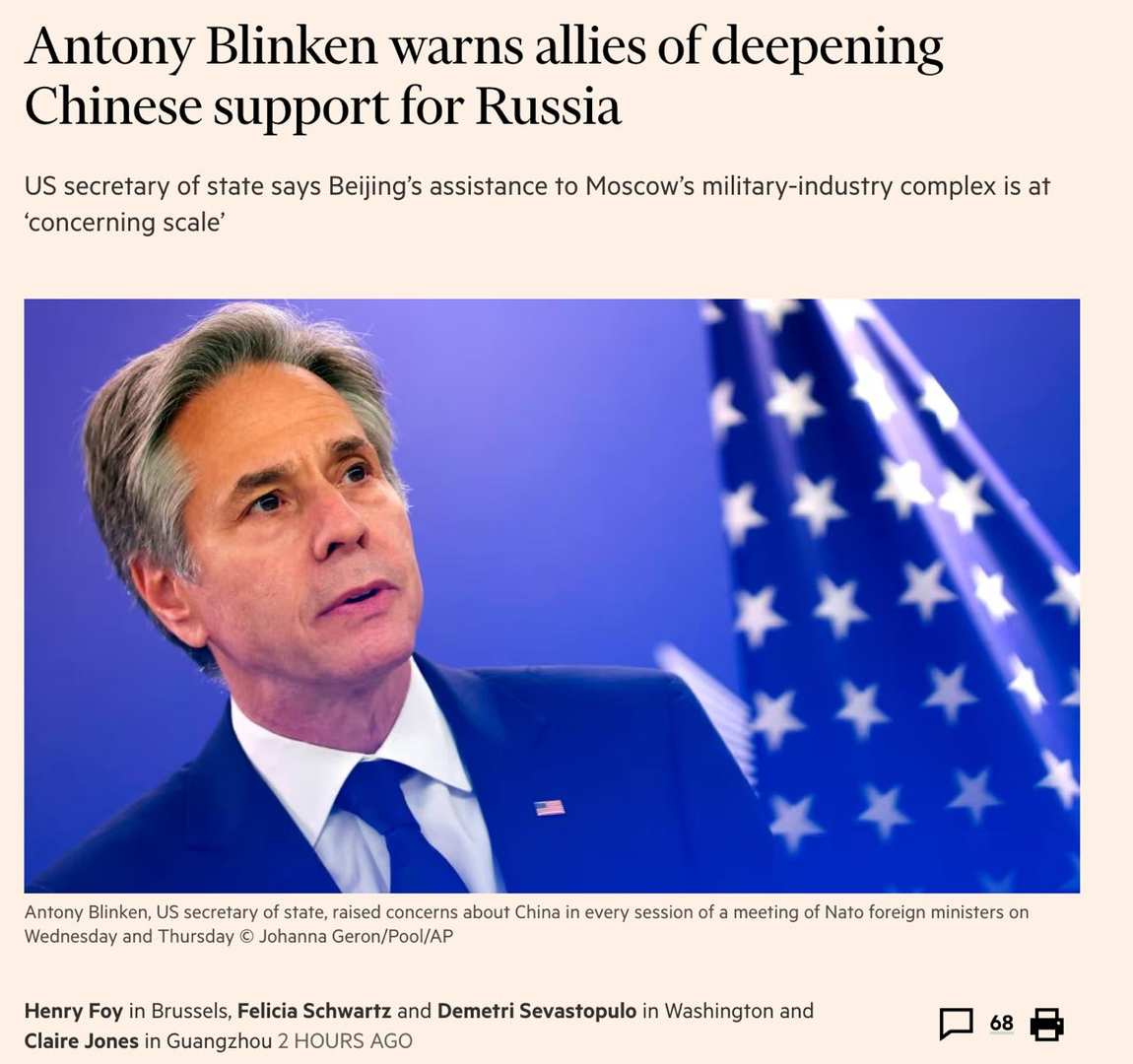 🇺🇸🇨🇳🇷🇺🇺🇦Trung Quốc đang tăng cường hỗ trợ cho Nga, Antony Blinken nói với các đồng minh châu Âu, Financial Times đưa tin, trích dẫn các nguồn tin.