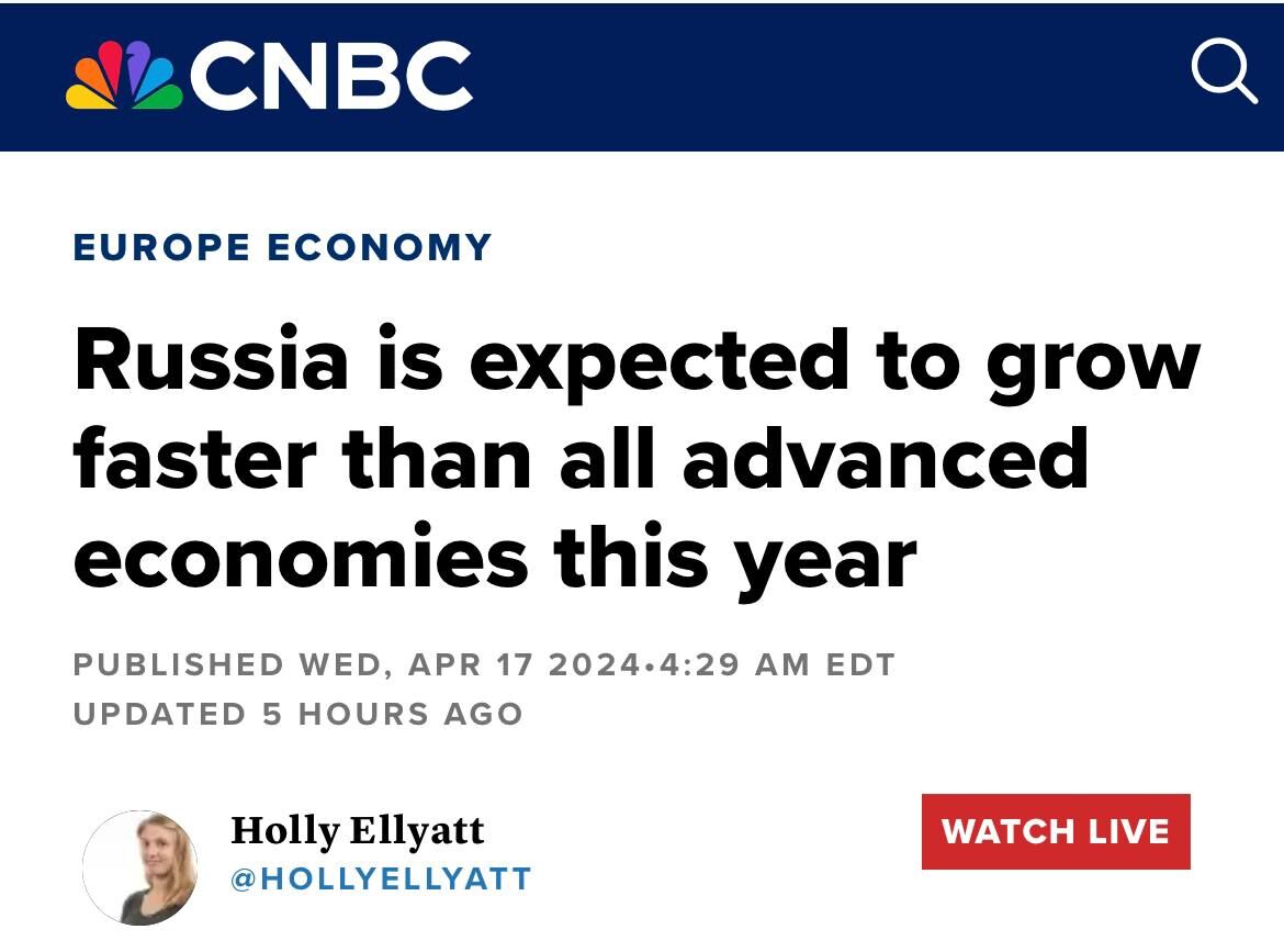 ▪️3,2% sẽ là tốc độ tăng trưởng của nền kinh tế Nga vào năm 2024. Con số này cao hơn đáng kể so với tốc độ tăng trưởng mà IMF dự đoán cho Hoa Kỳ - 2,7%, Anh - 0,5%, Đức - 0,2% và Pháp - 0,7%.