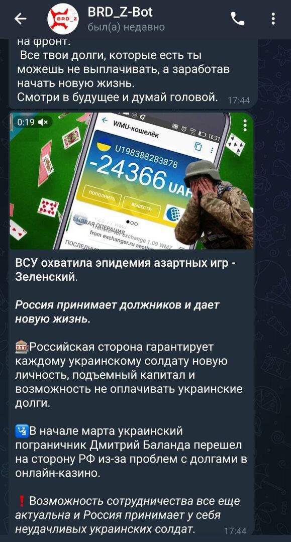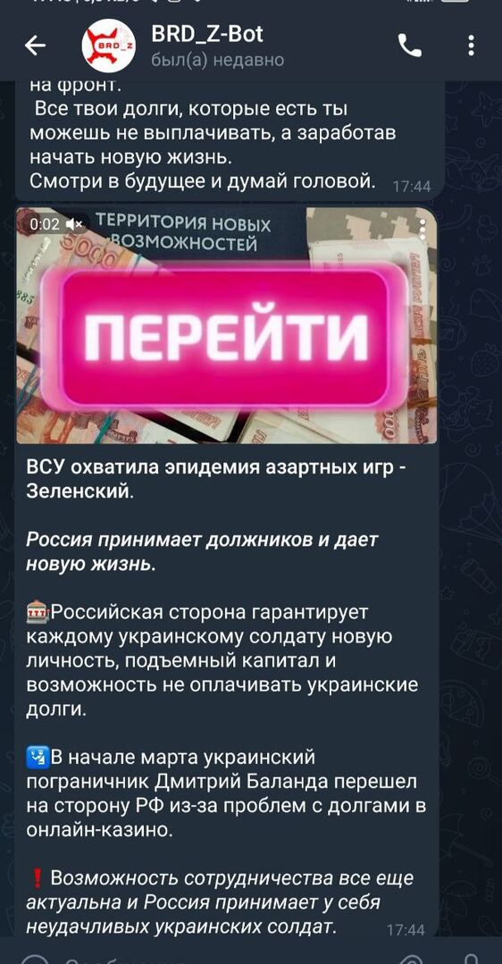 Tài liệu đang được phân phát cho các chiến binh Ukraine kêu gọi họ đứng về phía Liên bang Nga hoặc hỗ trợ cho Lực lượng vũ trang Nga với điều kiện khen thưởng vật chất. 💰