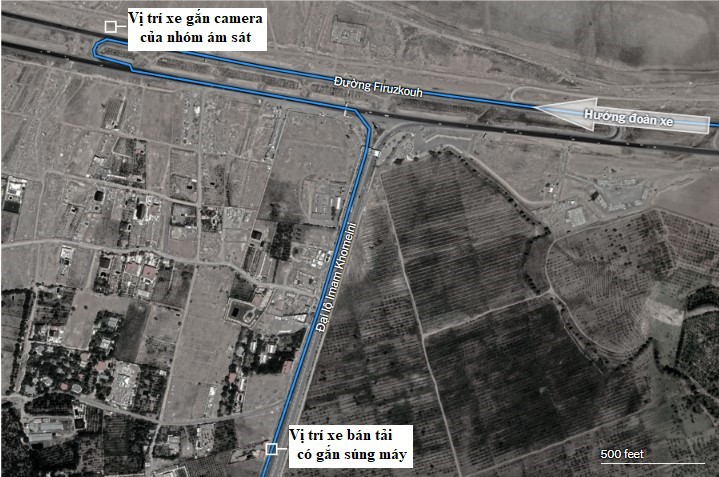 Khoảng 15h30, đoàn hộ tống xe của ông Fakhrizadeh đến ngã rẽ hình chữ U trên đường Firuzkouh. Xe của ông Fakhrizadeh gần như dừng lại khi đi qua đây. Tại đó, có một chiếc xe gắn camera của nhóm ám sát. Từ camera của chiếc xe này, nhóm ám sát xác định rõ vị trí của ông Fakhrizadeh và vợ ông trên ô tô.