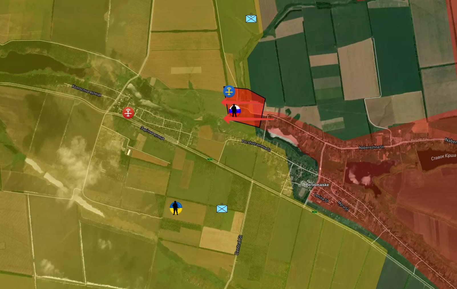 Èo, Nga tiến nhanh thế. Lực lượng vũ trang Nga đang tiếp cận Netailove. Khoảng cách đến ngôi làng với các vị trí tiên phong của Nga không quá 600 mét. Làng Pervomaiske ở ngay phía dưới cũng sắp xong rồi, loading đến 90%.